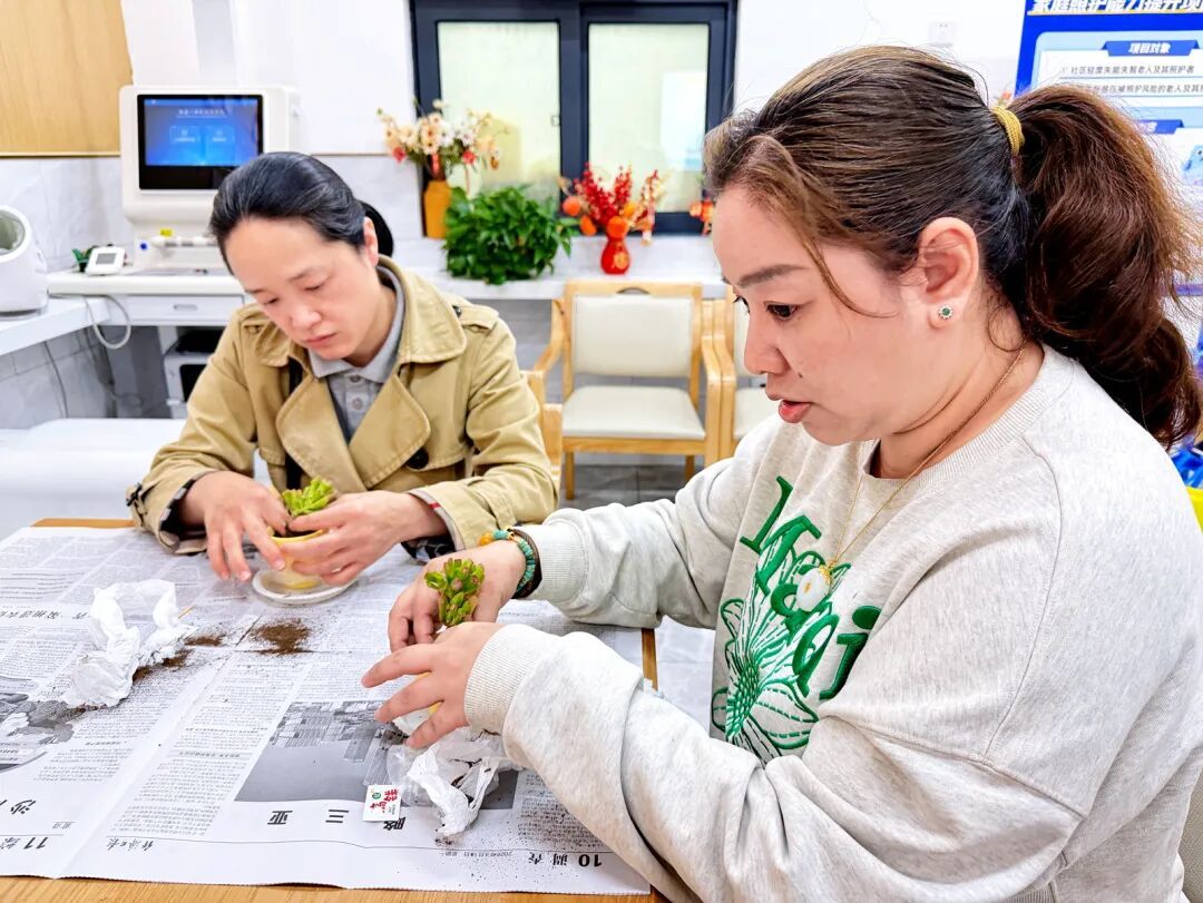 活动现场,社工向长者们讲解节气民俗智慧与物候变迁密码,同步传授多肉植物养护知识、种植技巧。长者们与青年志愿者围坐一桌,轻捧素陶花盆,细铺营养沃土,默契协作培土栽苗。老人们追忆往昔春日庭院莳花的岁月,将“看天栽种”“依时养护”的生活智慧娓娓道来;青年们则以耐心陪伴回应,协助培土固根、点缀装饰,让青春活力与岁月沉淀在方寸花盆间交融。