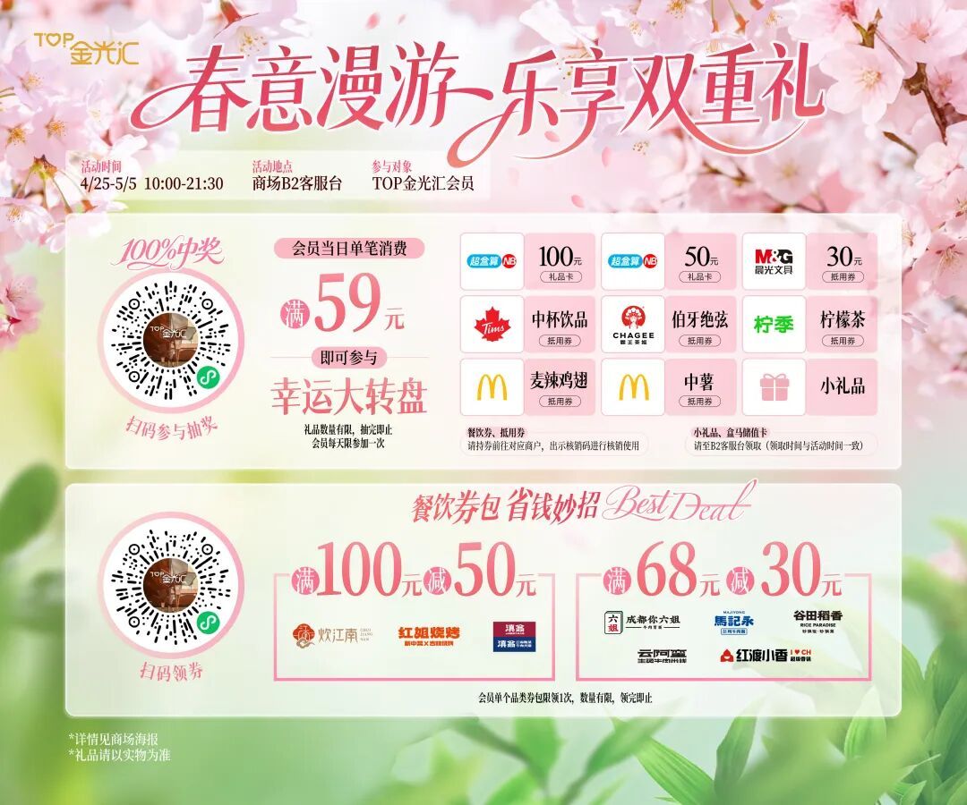 五一假期临近,TOP金光汇(连亮路368号)将于4月25日至5月5日推出“春意漫游 乐享双重礼”主题活动,为消费者带来持续11天的春日福利。活动涵盖幸运抽奖与餐饮优惠两大板块,更有餐饮首店重磅登陆商场,同步提升市民假期逛街与用餐体验。 TOP金光汇 活动期间,消费者当日单笔消费满59元,即可通过TOP金光汇小程序或前往B2服务台参与幸运大转盘抽奖。奖品包括盒马储值卡、现磨咖啡、饮品及小食等,中奖率为100%。此外,会员登录小程序可免费领取春日美食券包,包含餐饮消费满100元减50元、轻餐消费满68元减30元两张优惠券,适用于正餐与休闲小食等多种场景。 活动海报 值得一提的是,位于商场3层的滇翁云南酸菜牛肉火锅普陀首店也将于节日正式与饕客们见面。店铺主打新鲜空运食材,鲜切吊龙肉质嫩滑,菌菇拼盘汇集云南当地多种野生菌类,更有黑豆花、乳扇等特色小食,还原地道滇式风味。开业期间(同商场活动期)还将带来79折优惠,让消费者们吃得实惠。 滇翁云南酸菜牛肉火锅普陀首店 TOP金光汇自开业以来有效填补了桃浦地区集中式社区商业的空白,目前商场整体招商率已超90%,超九成店铺为桃浦首店,涵盖超市、影院、餐饮、零售、健身、亲子等多个业态。围绕“全龄悦享、家庭共融”整体定位,项目“星旅启程”大台阶、儿童乐园等多元主题空间也正成为周边居民“家门口的城市会客厅”。此次假日期间,大台阶处还将焕新春日漫游步道,解锁打卡逛街新场景。“我们正通过越来越完善的业态持续丰富周边市民选择,此后还计划引入二次元活动等,进一步吸引年轻客群。”TOP金光汇相关负责人介绍。 春日漫游步道效果图 春风正好,福利已备。不妨趁五一假期前往TOP金光汇,感受春日漫游的惬意与实惠,一站式满足假期游玩需求。 TOP金光汇