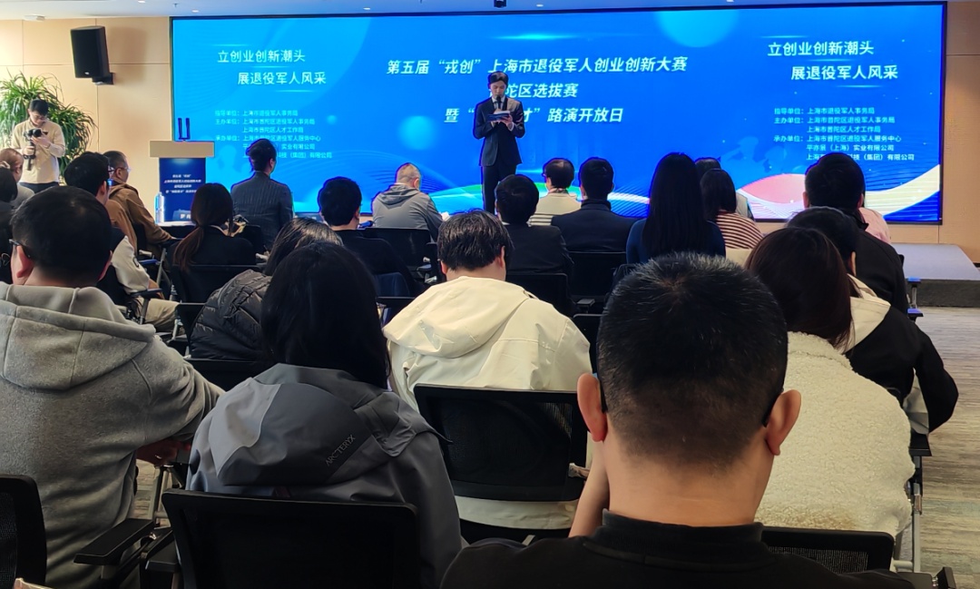 4月23日,第五届“戎创”上海市退役军人创业创新大赛普陀区选拔赛暨“海聚英才”路演开放日,在普陀区信泰中心“海聚英才”路演大厅火热开赛。上海市退役军人事务局党组成员、副局长丁振文为获奖企业颁奖,普陀区副区长胡建会出席。 大赛现场 大赛以“立创业创新潮头 展退役军人风采”为主题,来自科技创新、银发经济、宠物经济、体育产业等多个领域的10支退役军人创业团队同台竞技,通过“路演+答辩”,展示创新项目,展现退役军人投身高质量发展浪潮的硬核实力。