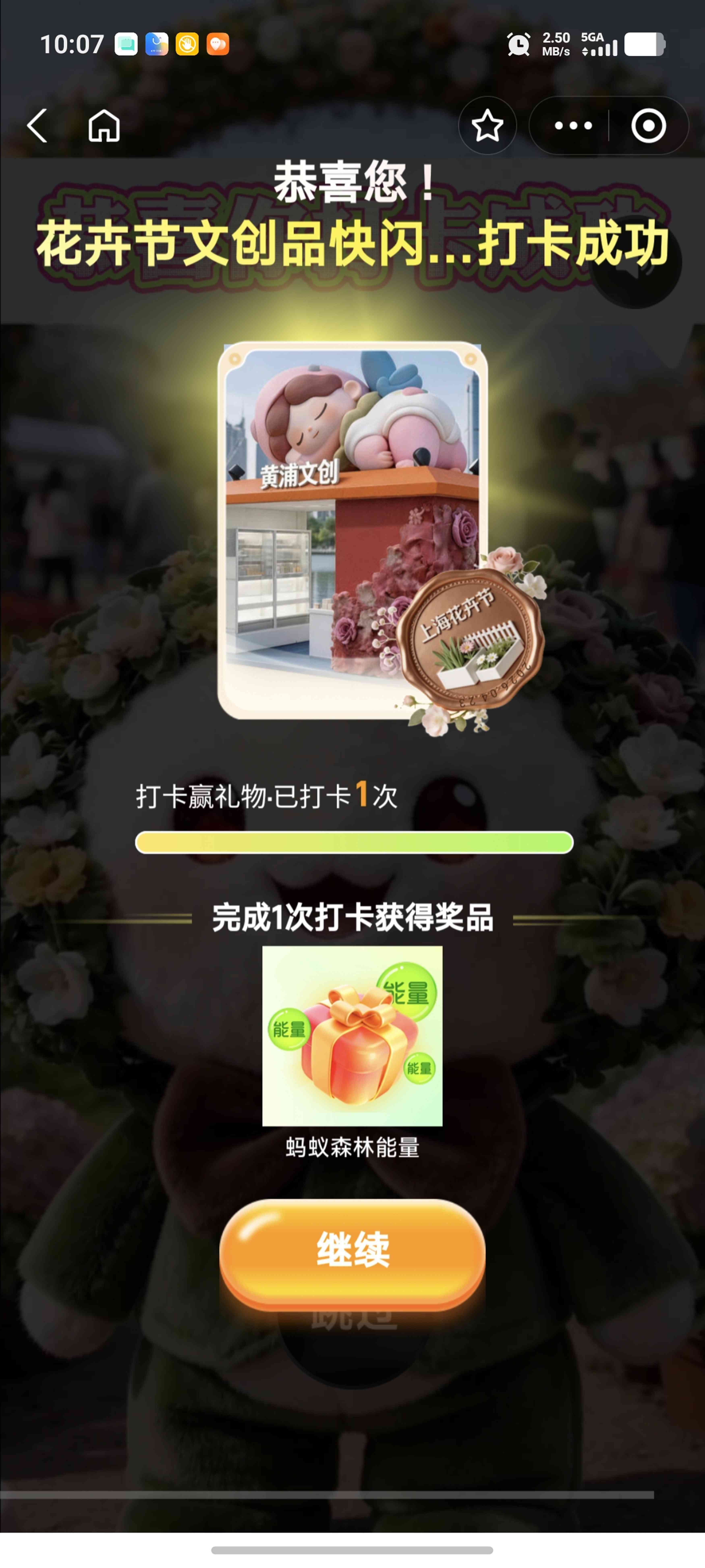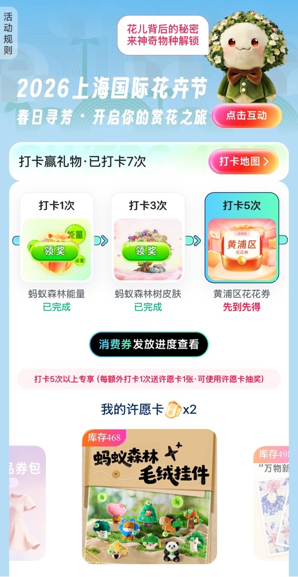 打卡累积达到一定次数,消费者可解锁多重权益:蚂蚁森林能量、花卉节限定蚂蚁森林皮肤等不同门槛的权益福利。值得留意的是,按规则完成5次有效打卡,即有机会获得本次活动专属消费券“花花券”,“花花券”每日限量发放,先到先得,可在黄浦区指定商户核销。此外,用户完成5次打卡后,每多完成1次打卡可获得1张许愿卡,可用于抽取商户权益或兑换限量实物商品,打卡越多,惊喜越多。