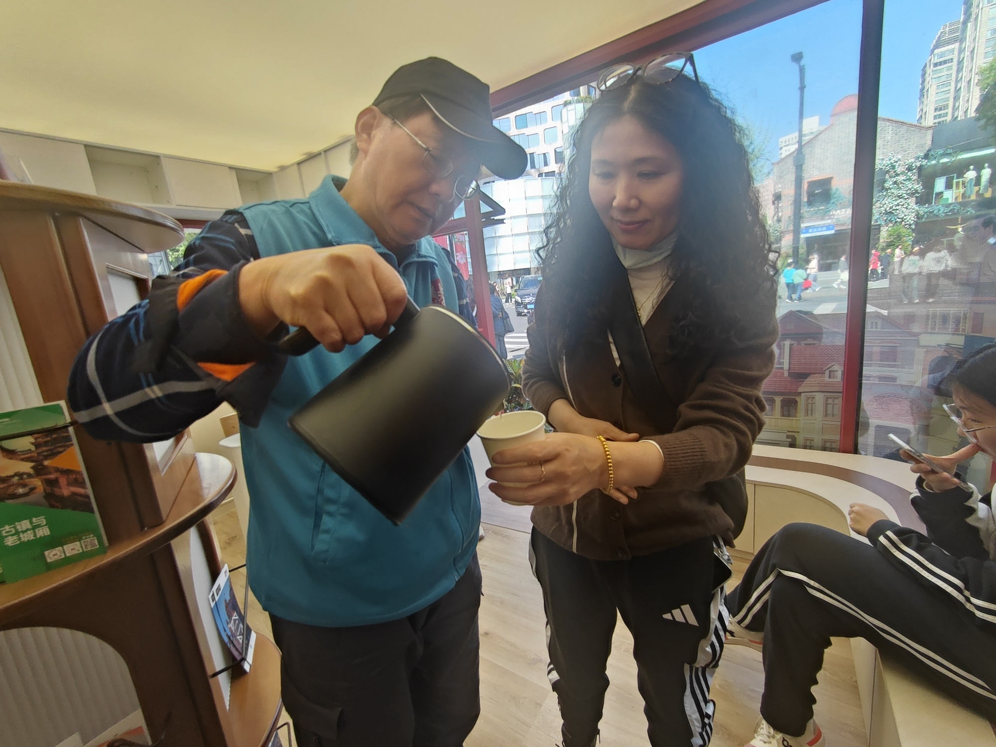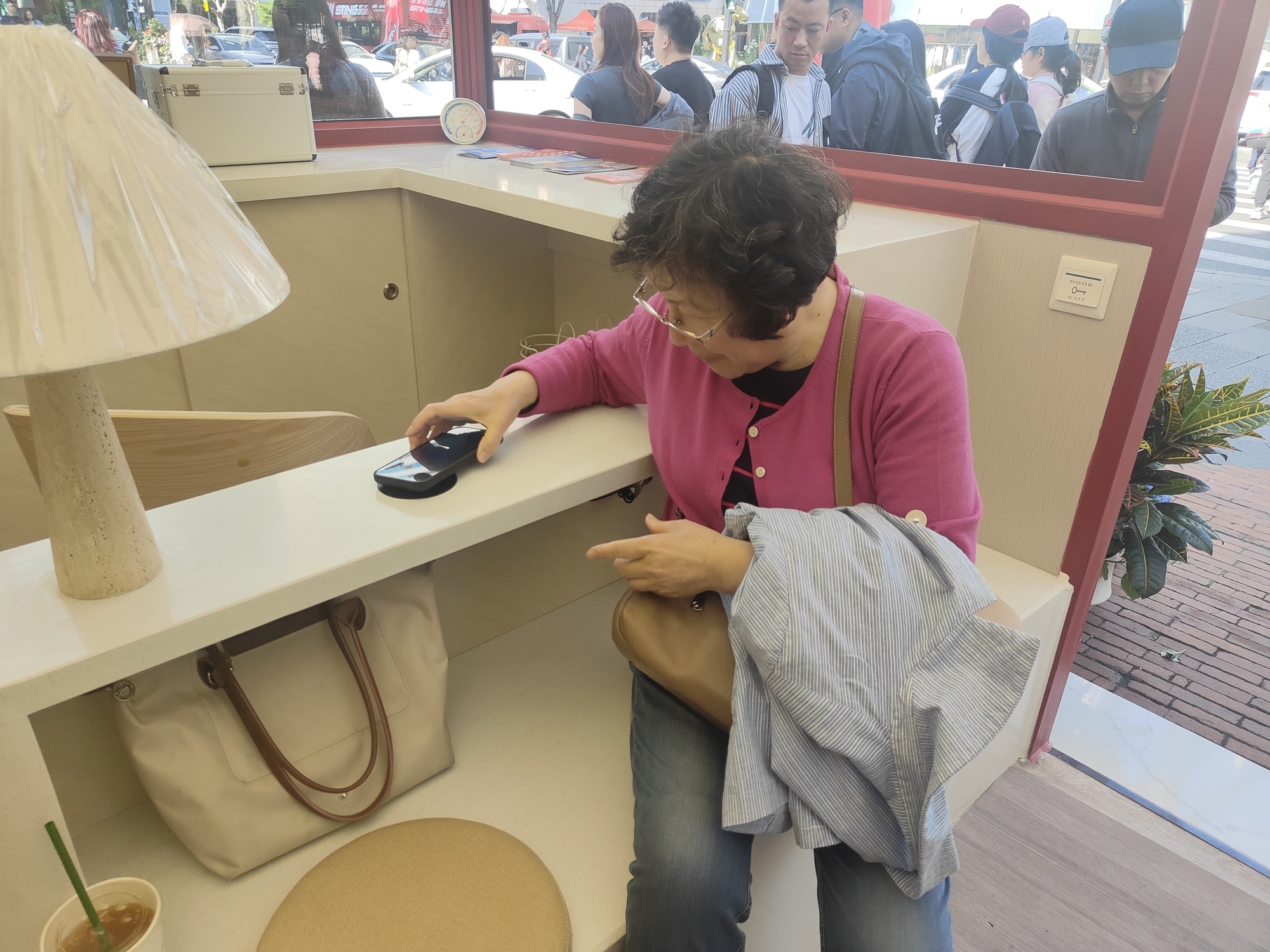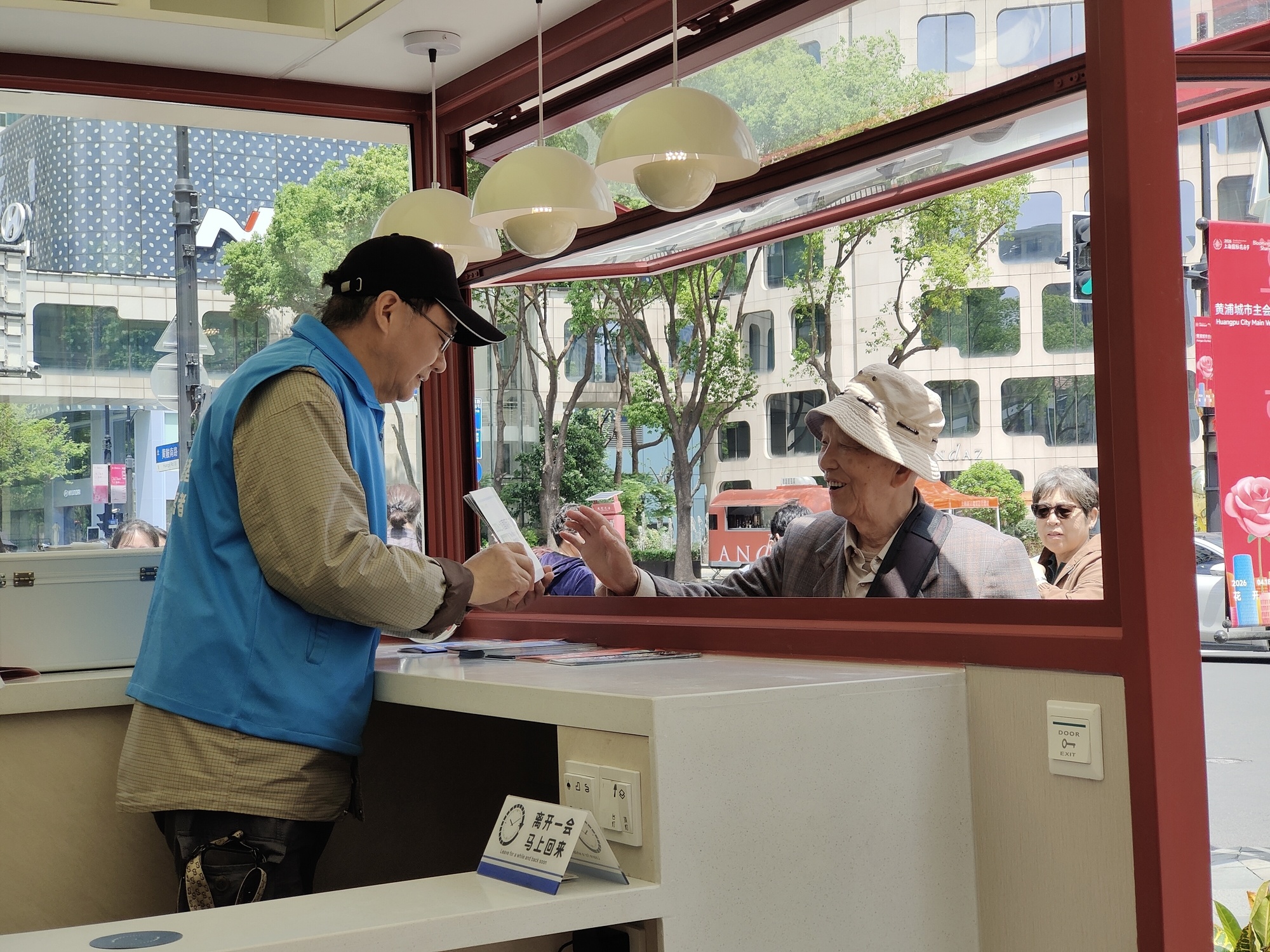 居民方女士也约了朋友一起看花,久等不到后,走进站点坐下休息,同时拨通朋友电话:“喂,你别急,慢慢走,我有地方坐着等,就在太仓路黄陂南路口的红色志愿服务亭里。”