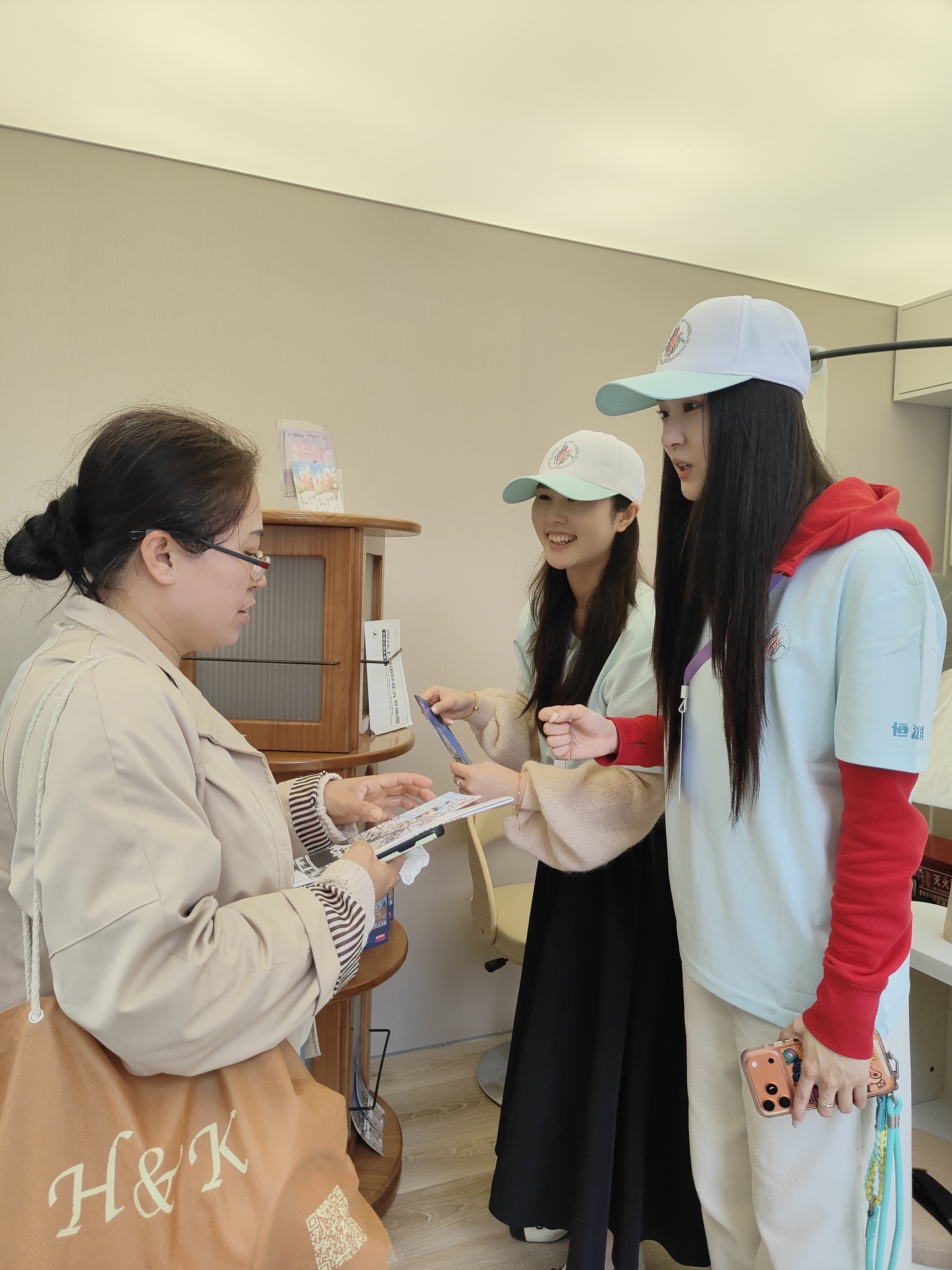 游客李女士匆匆跑到站点,着急地向志愿者求助:“你好,请问离这里最近的充电宝租赁点在哪里?我手机只剩1%的电了。”志愿者亲切地宽慰她:“别着急,我们这里有应急充电,还可以无线充电。”“谢谢志愿者,这里真的很不错。”