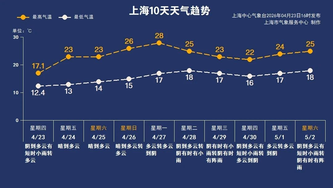 新的一天,带着热爱出发,用心生活,不负时光,不负自己。 今日天气 阳光回归,气温回升 暖意洋洋,体感舒适 注意早晨前后局部地区有雾 休假多日的太阳公公回归啦! 申城今天晴到多云, 最低气温在13℃左右, 早晨仍有凉意, 好在白天阳光助力, 气温迅速爬升, 最高气温回到23℃附近, 相对湿度90%~40%, 偏东风3-4级, 暖意洋洋,体感舒适。 但需留意, 早晨前后局部地区有雾, 开车缓行,注意安全。 天气趋势 本周末至下周一,阳光热情放送,气温一路爬升,周一达到28℃左右,是近期顶点,大家抓住出行、洗晒好时机,尽情享受春天!昼夜温差较大,建议使用“洋葱穿衣法”。 下周二起,大气环流调整,本市又将出现一段阴阴雨雨的天气,气温小幅回落。春季天气变化较快,请大家随时关注预报信息。