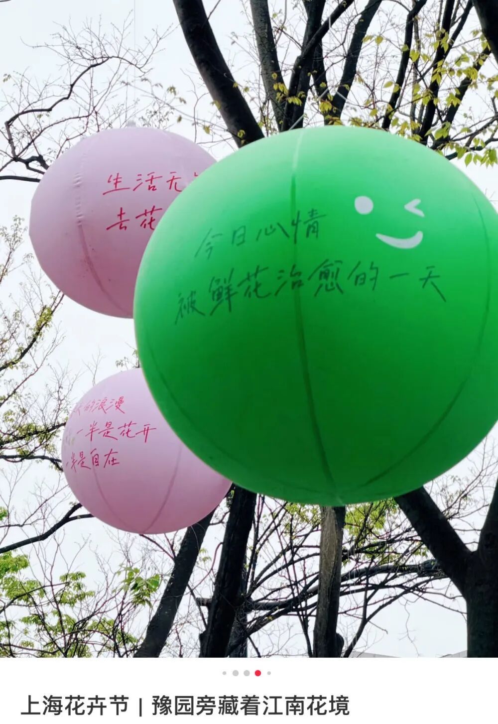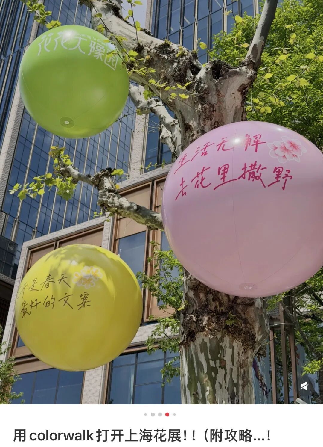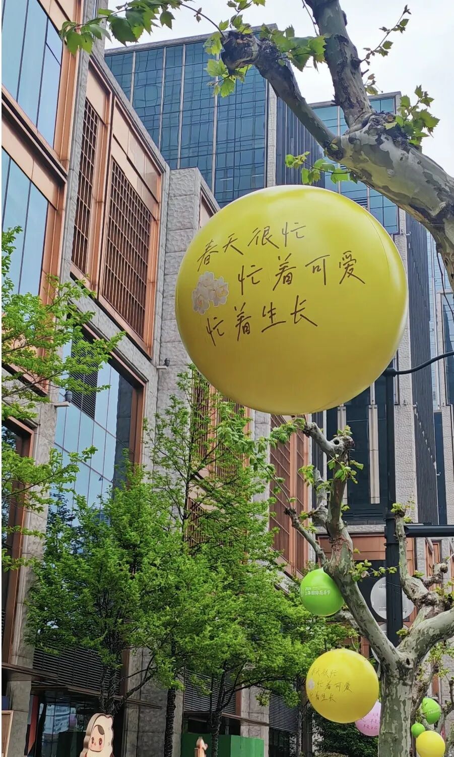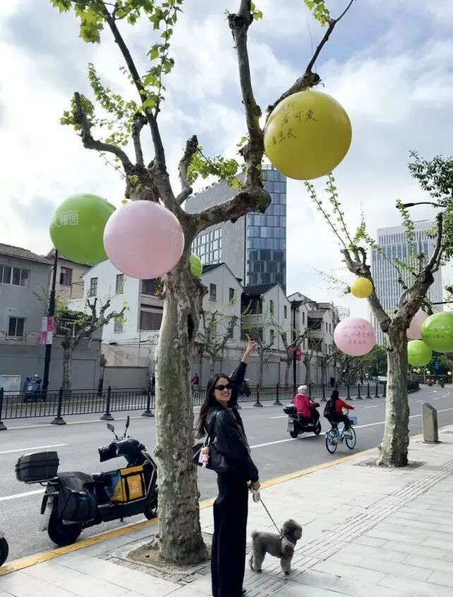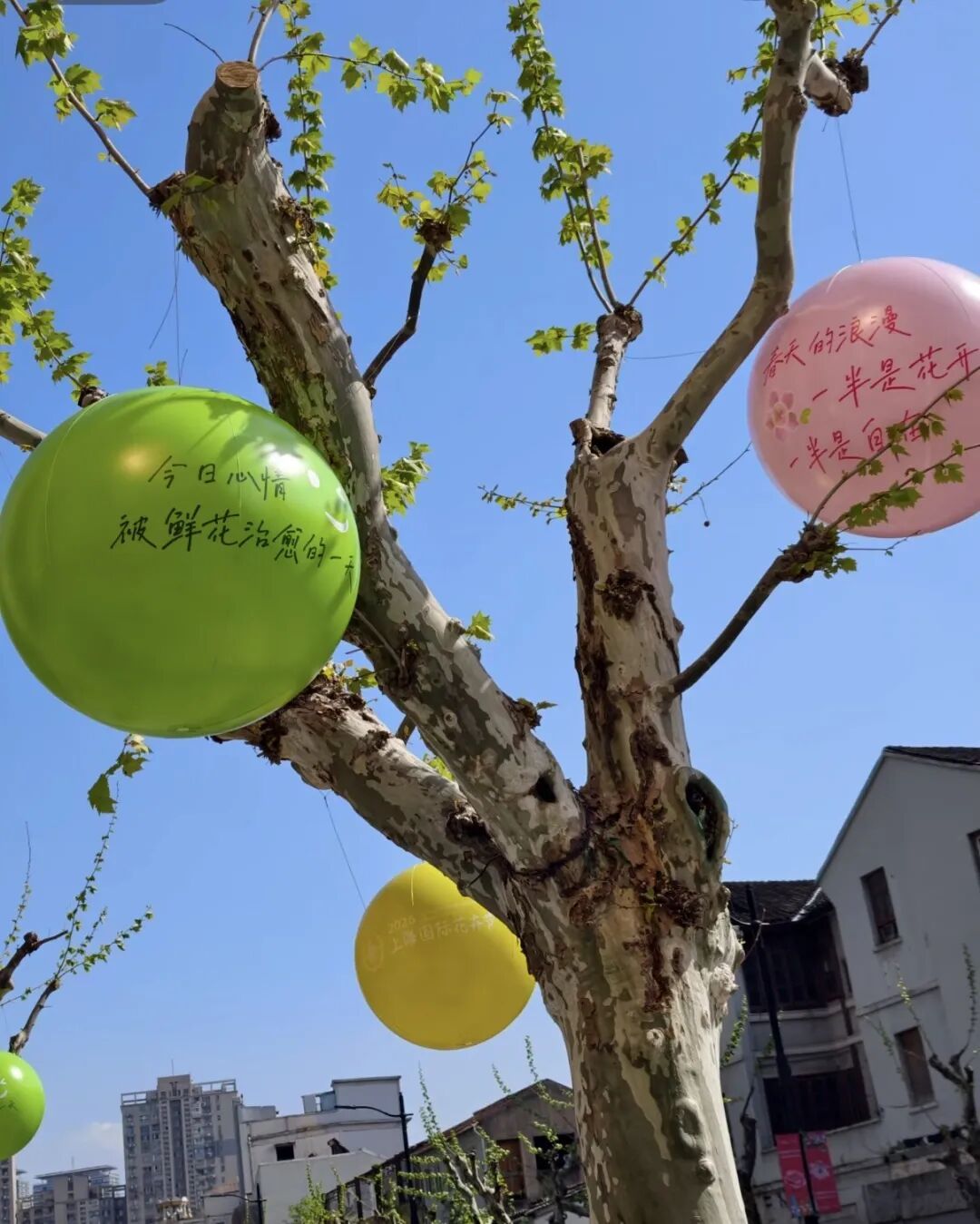 阳光穿过梧桐的新叶,落在气球上