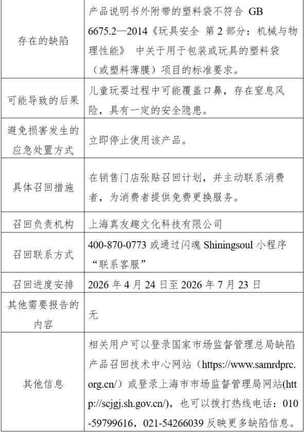产品说明书的塑料袋不符合GB6675.2—2014《玩具安全 第2部分:机械与物理性能》中关于用于包装或玩具的塑料袋(或塑料薄膜)项目的标准要求。儿童玩耍过程中可能覆盖口鼻,存在窒息风险,具有一定的安全隐患。消费者立即停止使用该产品。公司将在在销售门店张贴召回计划,并主动联系消费者,为消费者提供免费更换服务。上海真友趣文化科技有限公司 400-870-0773或通过闪魂Shiningsoul小程序“联系客服”。供稿:市局质量发展处