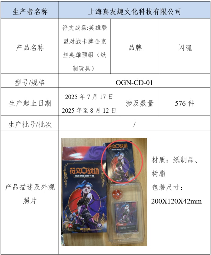 上海真友趣文化科技有限公司自2026年4月24日至2026年7月23日召回2025年7月17日2025年至8月12日生产的闪魂牌符文战场:英雄联盟对战卡牌金克丝英雄预组,共计576件。