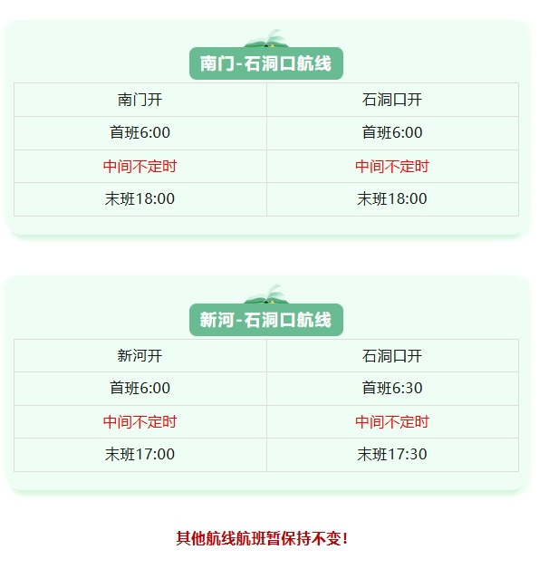 小编从上海客轮公司了解到,2026年5月1日至5月5日“五一”假期期间,上海客轮公司调整南门-石洞口、新河-石洞口航线车客渡航班计划,首末班航班定时开航,中间时间段视现场车客流情况实行不定时航班。2026年5月6日起恢复原有航班。
