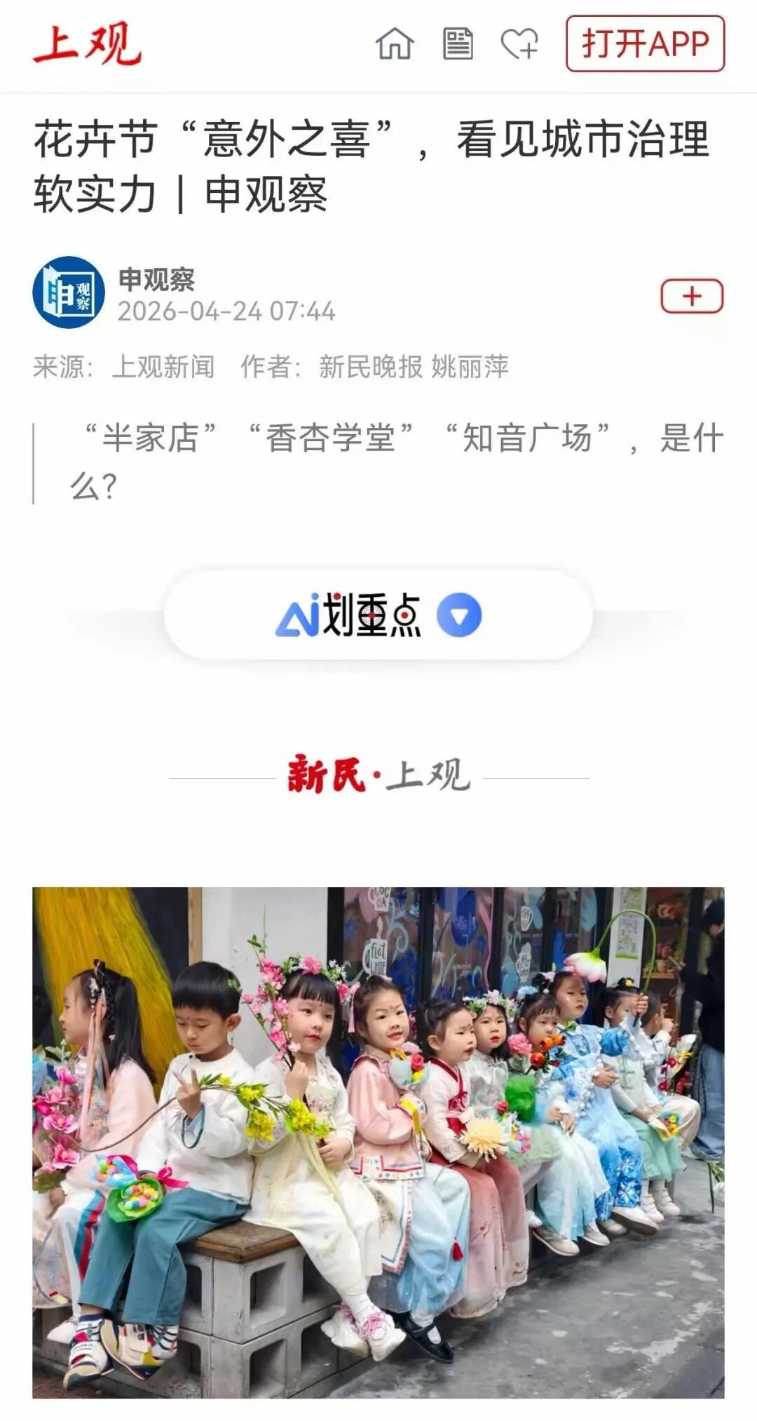 4月18日,“家门口的花卉节”开幕啦。放眼小马路,街角、路边、店前,花似锦、人如潮,处处笑语欢声,超乎预期!居民朋友和社区楼宇白领扮演的“十二花神”亮相街头,人们争相互动,“花神”妆容不算精致、表演不算专业,却格外亲切——这,就是家门口的烟火盛典!