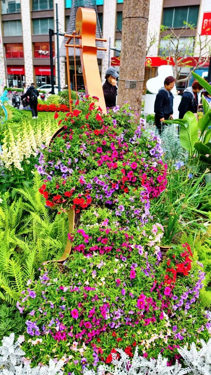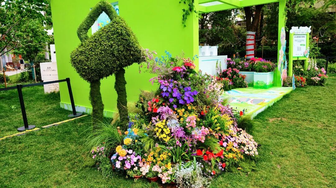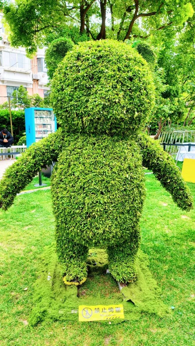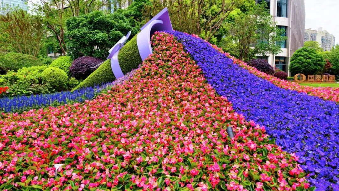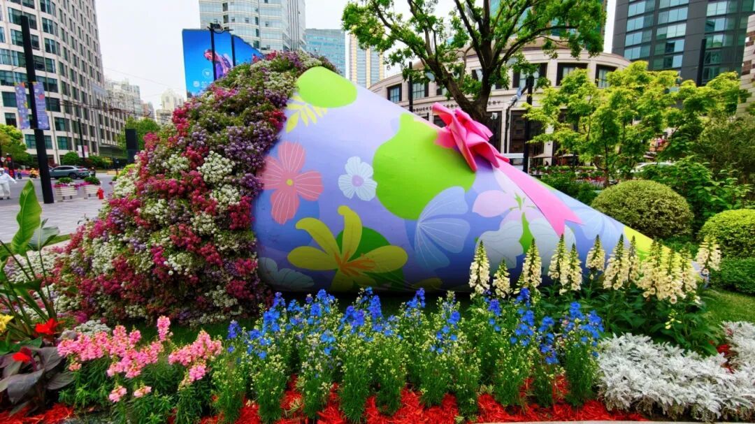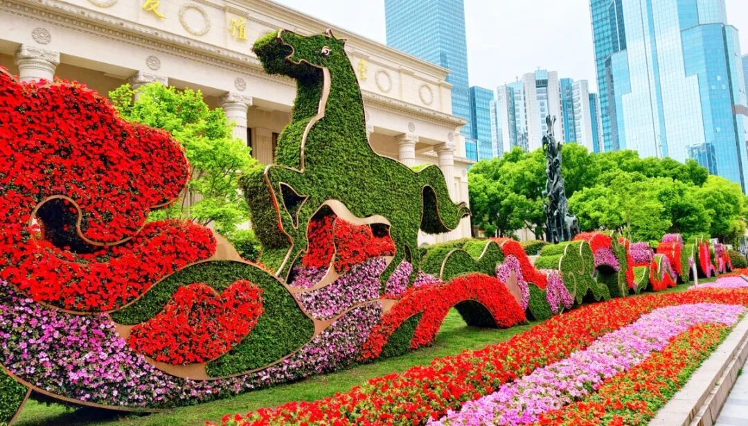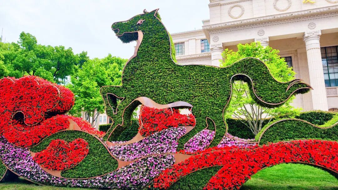 南京西路西康路路口,友谊会堂东侧广场;“马踏祥云”主题绿雕,骏马造型灵动,搭配鲜花,大气有辨识度。