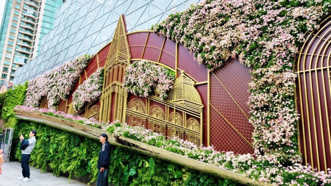 凤阳路石门二路路口,与新华绿地相邻;花瀑造型,鲜花缠绕绿植,氛围感十足,适配多种穿搭。