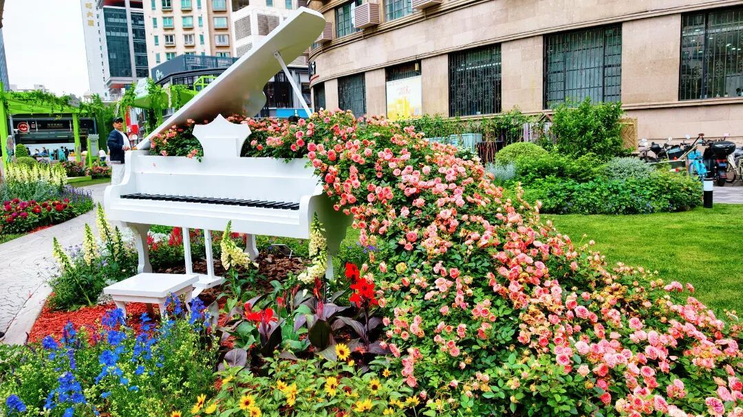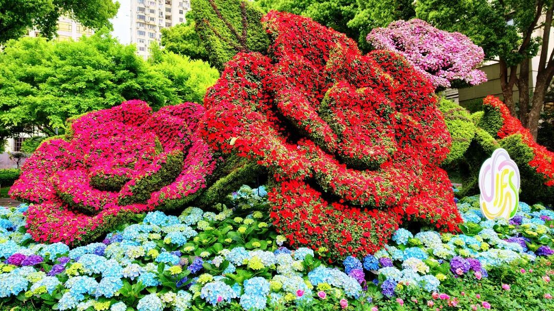 南京西路1398号,比邻上海商城,友谊会堂对面;大片玫瑰盛放,色彩丰富。