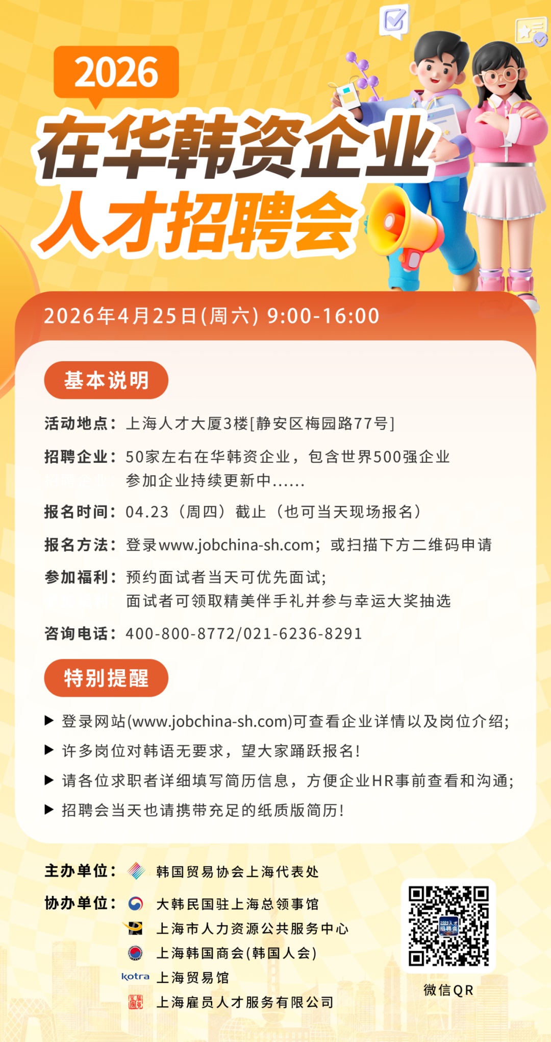 2026年求职季重磅来袭,由韩国贸易协会上海代表处主办的“2026在华韩资企业人才招聘会”,于4月25日(周六)开展,欢迎各位求职者踊跃报名参与!