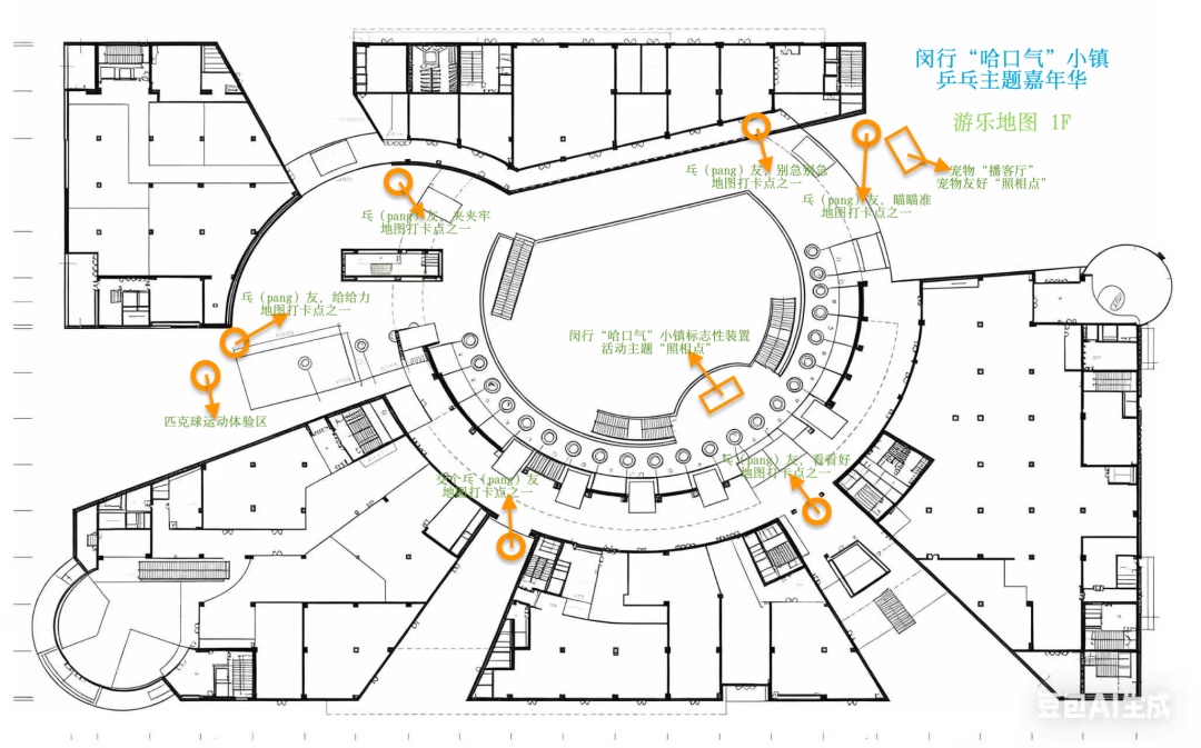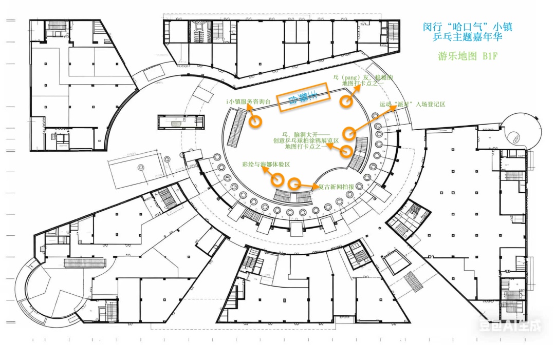 以图为例——左区:i小镇咨询服务台→主舞台区域→右后方:乓(pang)友,稳稳的(地图打卡点之一)→右区:运动“派对”入场登记区→右前方:乓,脑洞大开——创意乒乓球拍涂鸦展览区(地图打卡点之一)→左前方:复古新闻拍报→彩绘与海娜体验区