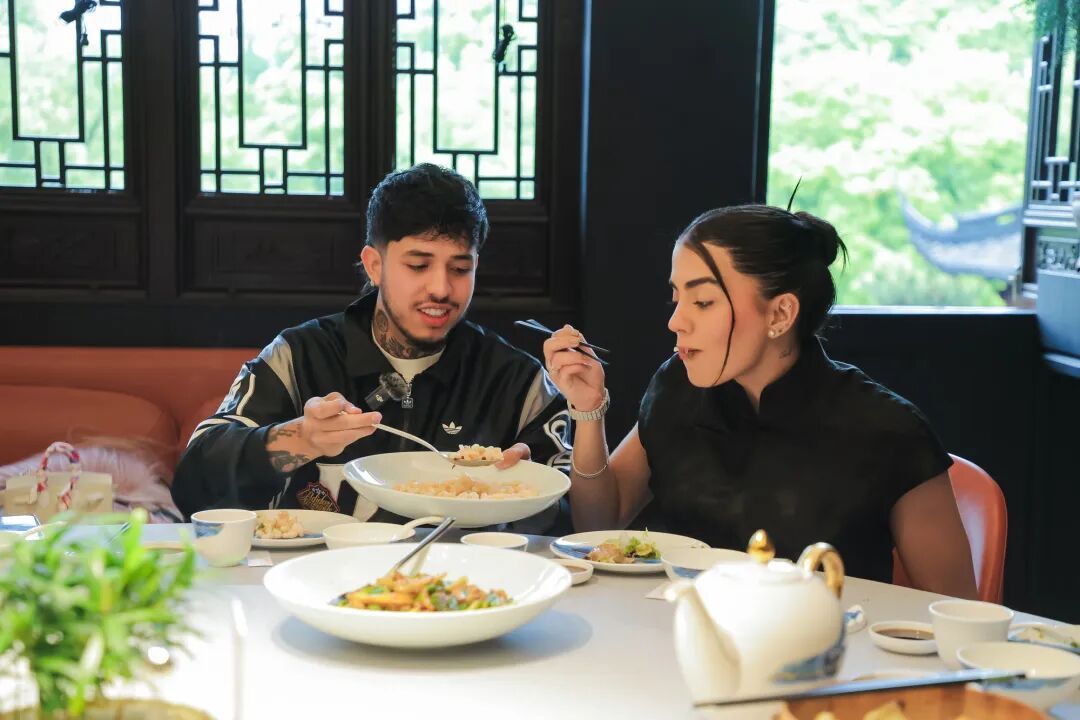 活动伊始,WestCOL走进豫园绿波廊,品尝桂花拉糕、蟹粉小笼包、松鼠桂鱼等本帮经典。桂花拉糕“粘盘、粘筷、不粘牙”的软糯口感、葫芦酥形似葫芦谐音“福禄”的吉祥寓意,让他对海派美食的精巧留下深刻印象,最热闹的环节是“筷子技巧挑战”,他兴致勃勃地夹起拉糕,成功后转身跟同行的伙伴一起举手庆祝,笑声不断。餐后穿过九曲桥,在湖心亭茶楼旁驻足,导游指着豫园的老建筑向他介绍道:“This is the real Shanghai.”