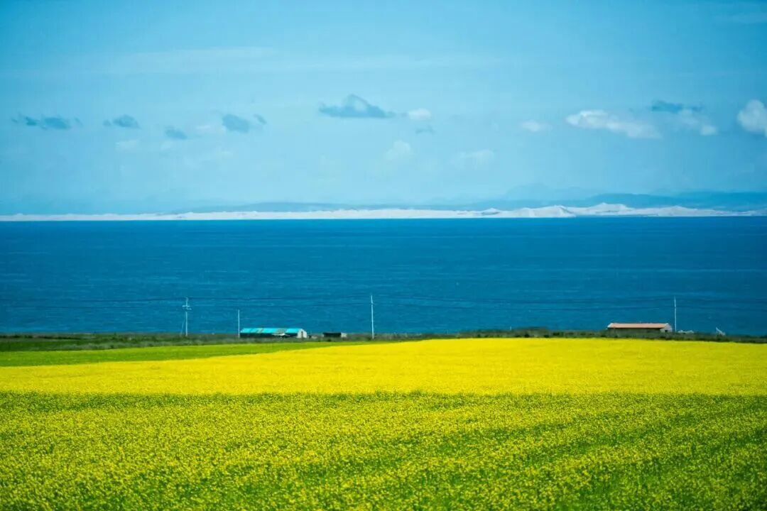 透过油菜花田看到的青海湖