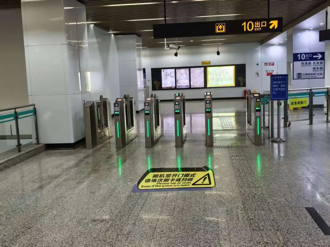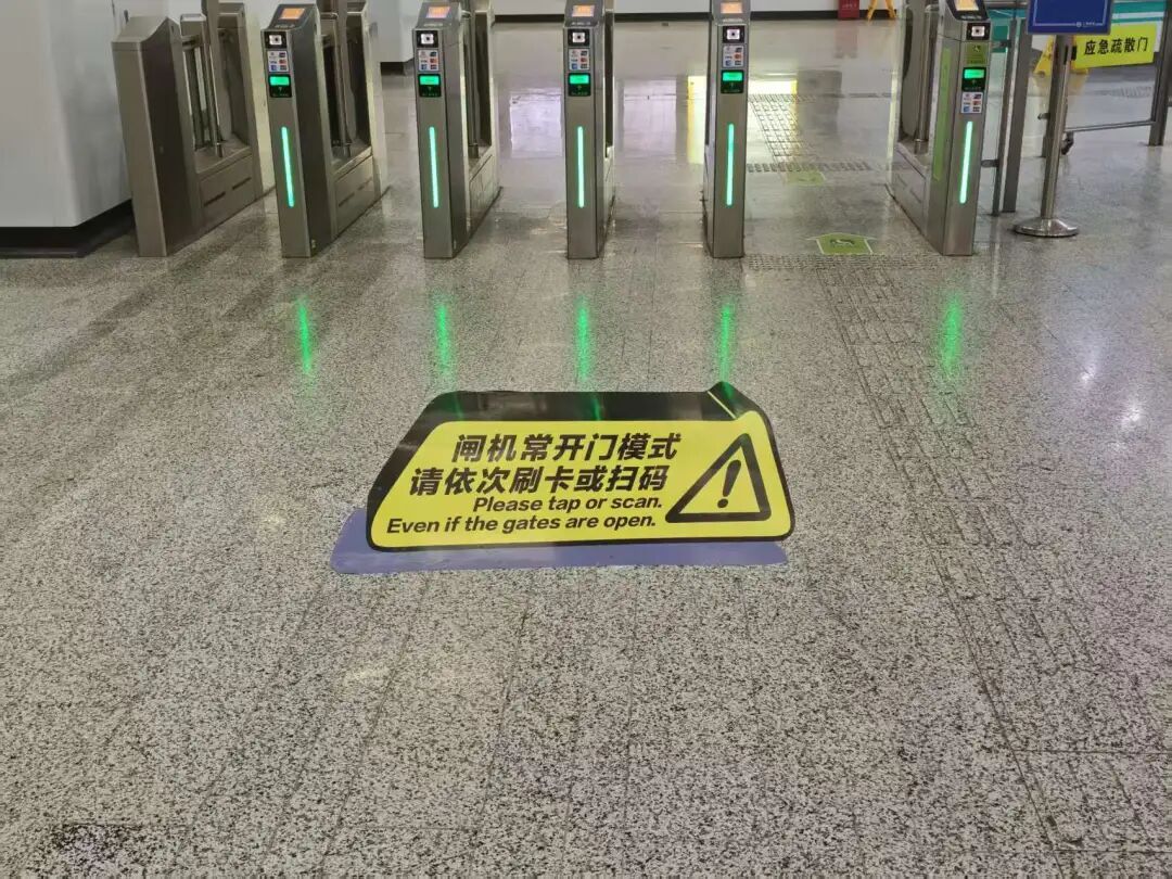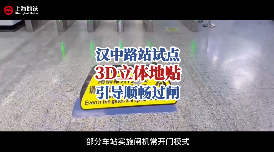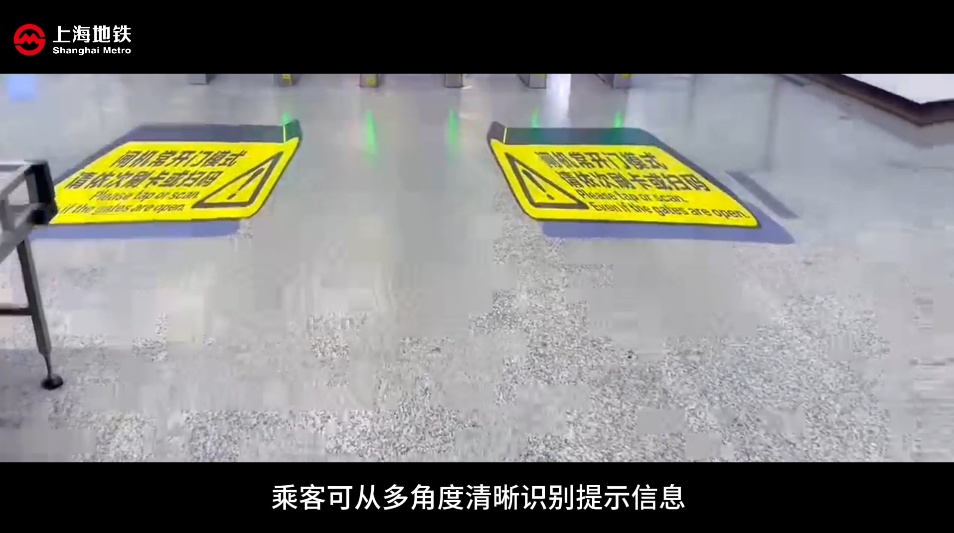 在上海地铁,部分车站实施“闸机常开门” 模式,闸机扇门默认保持开启,乘客刷卡或扫码后,屏幕显示绿色通行箭头,即可顺畅通行。近日,地铁汉中路站在进出站闸机区域,配套试点设置专属提示地贴。地贴采用黑黄撞色设计,运用 3D 视觉立体工艺,乘客可从多角度清晰识别提示信息,进一步强化引导乘客扫码/刷卡通行。