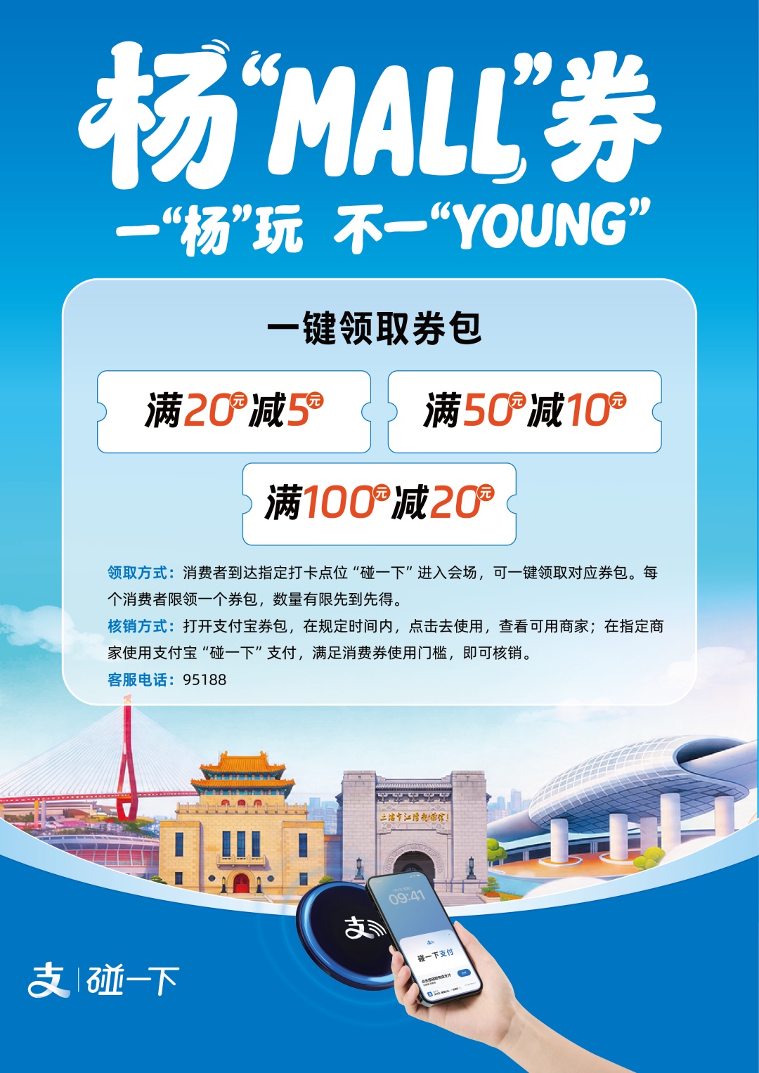 活动现场通过支付宝 “碰一下”装置进入活动页面,查看参与商户并领取,数量有限,先到先得。