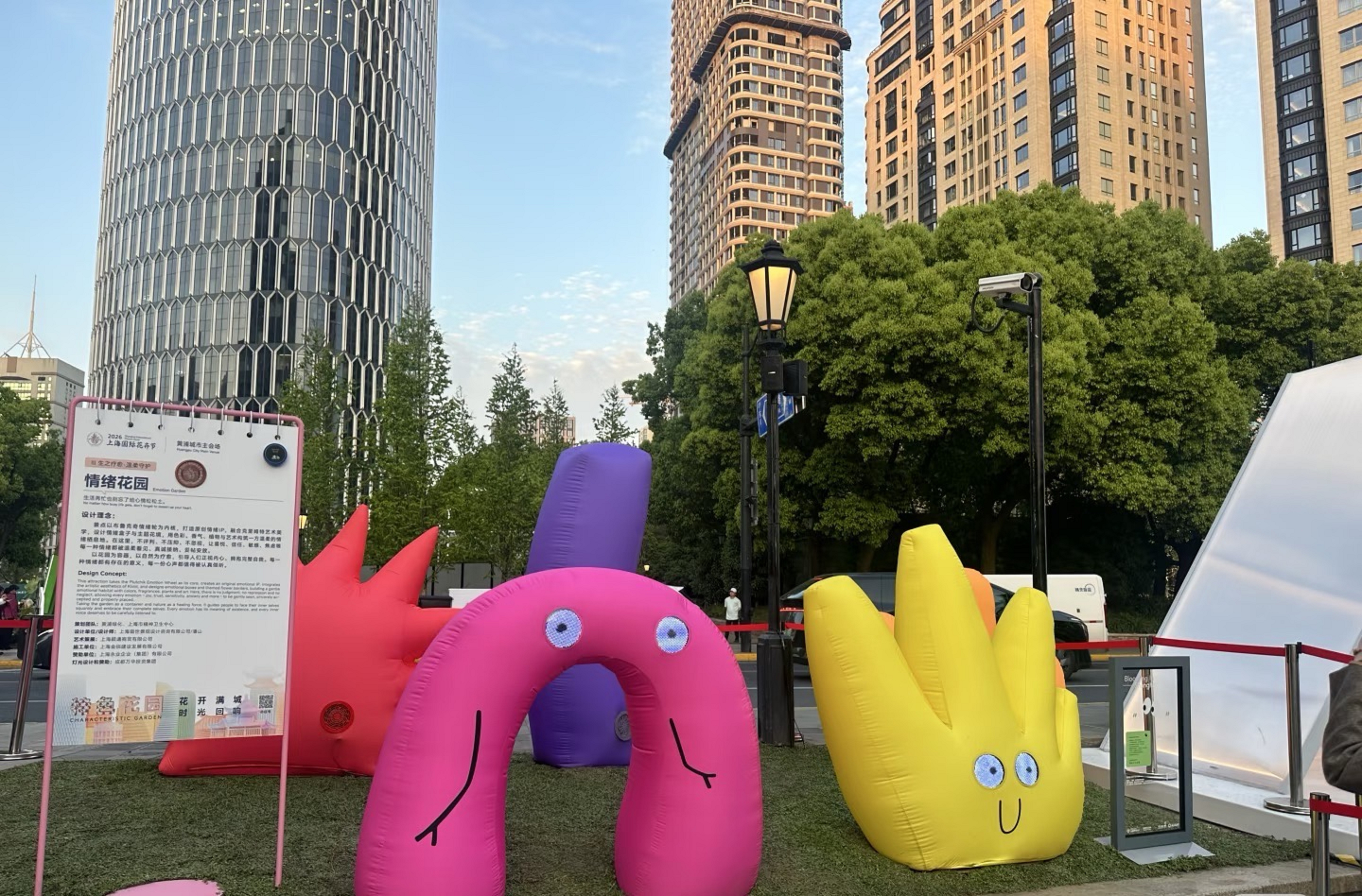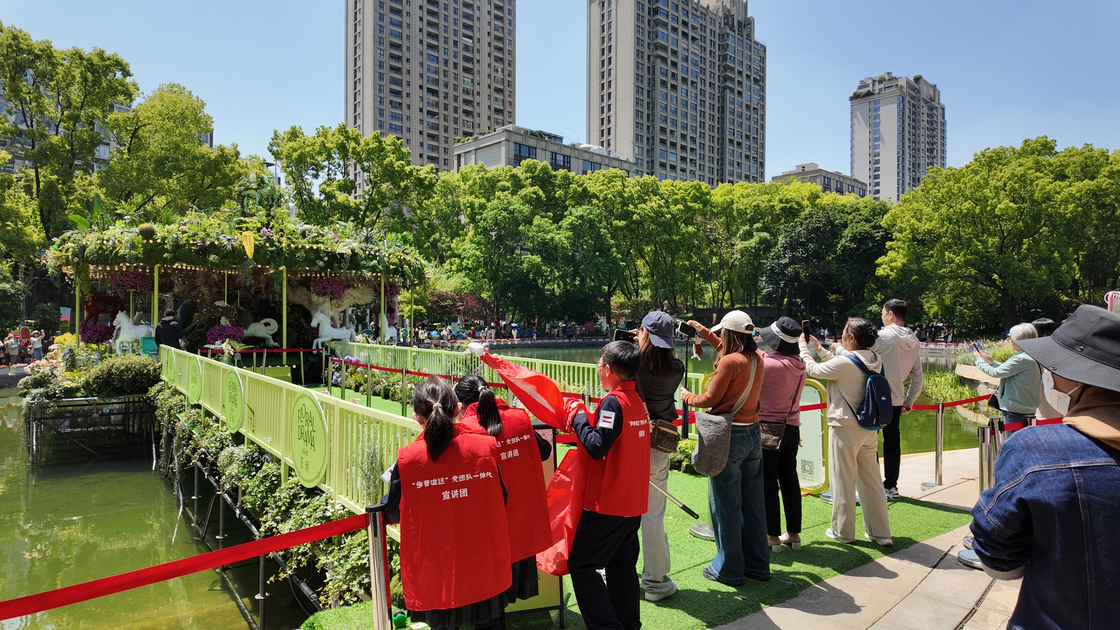 由陈雯静老师带领的小分队选择了新天地主会场的“马上走花路”花园,这座矗立在太平湖水面的花艺装置,以经典旋转木马为原型,五匹繁花骏马错落其间,通体被鲜妍花簇与青翠绿植温柔包裹,底座轻浮于水面,花香随水波轻轻荡漾,藏着“以花为愈,以梦为马”的浪漫期许。“我们觉得这个装置和小朋友的成长息息相关,就像孩子们的成长之路,有鲜花相伴,有梦想同行,每一步都充满希望。”陈雯静老师的话语里,满是对孩子们的期许。