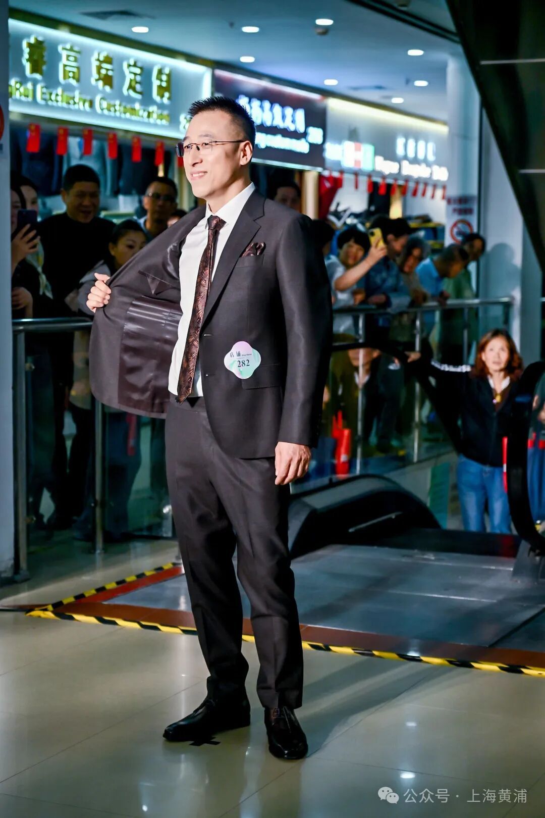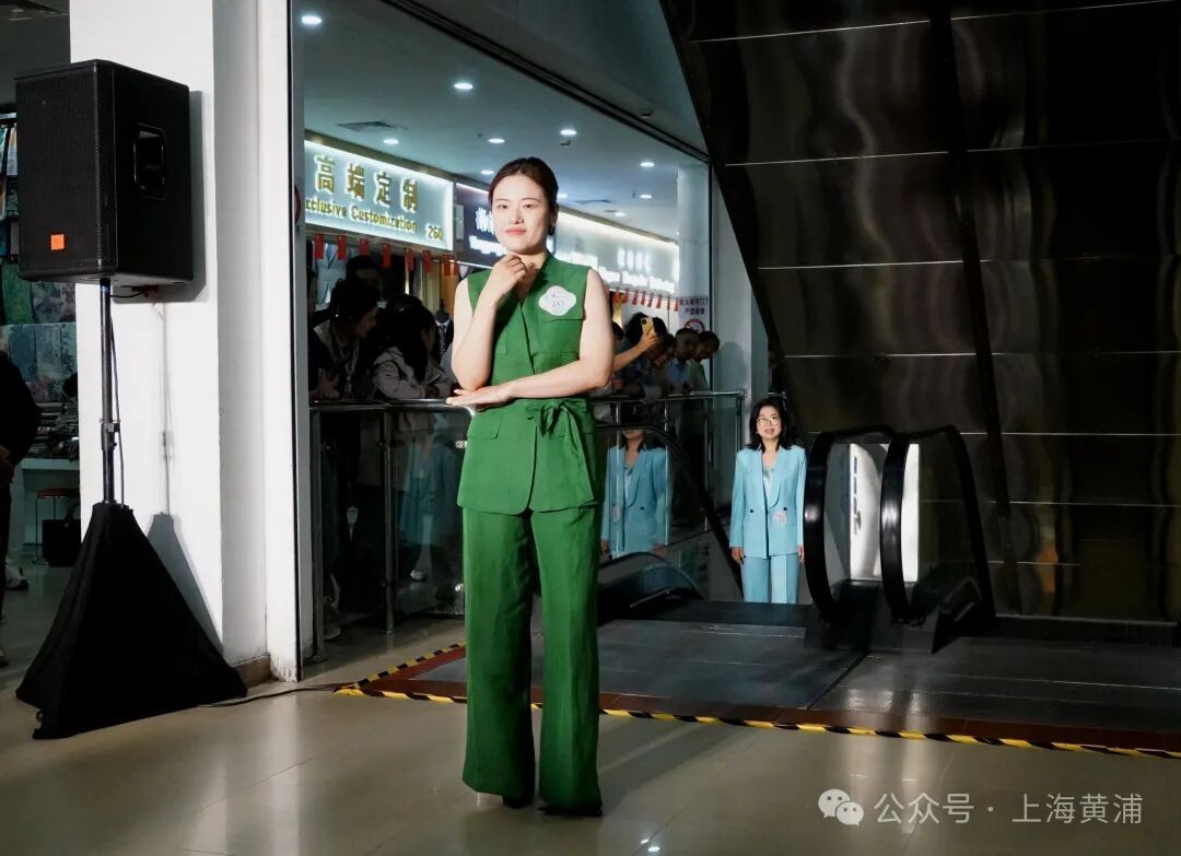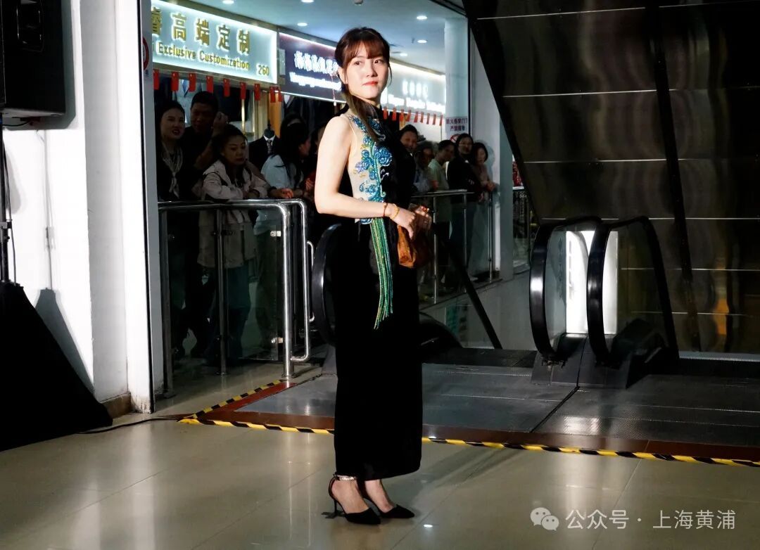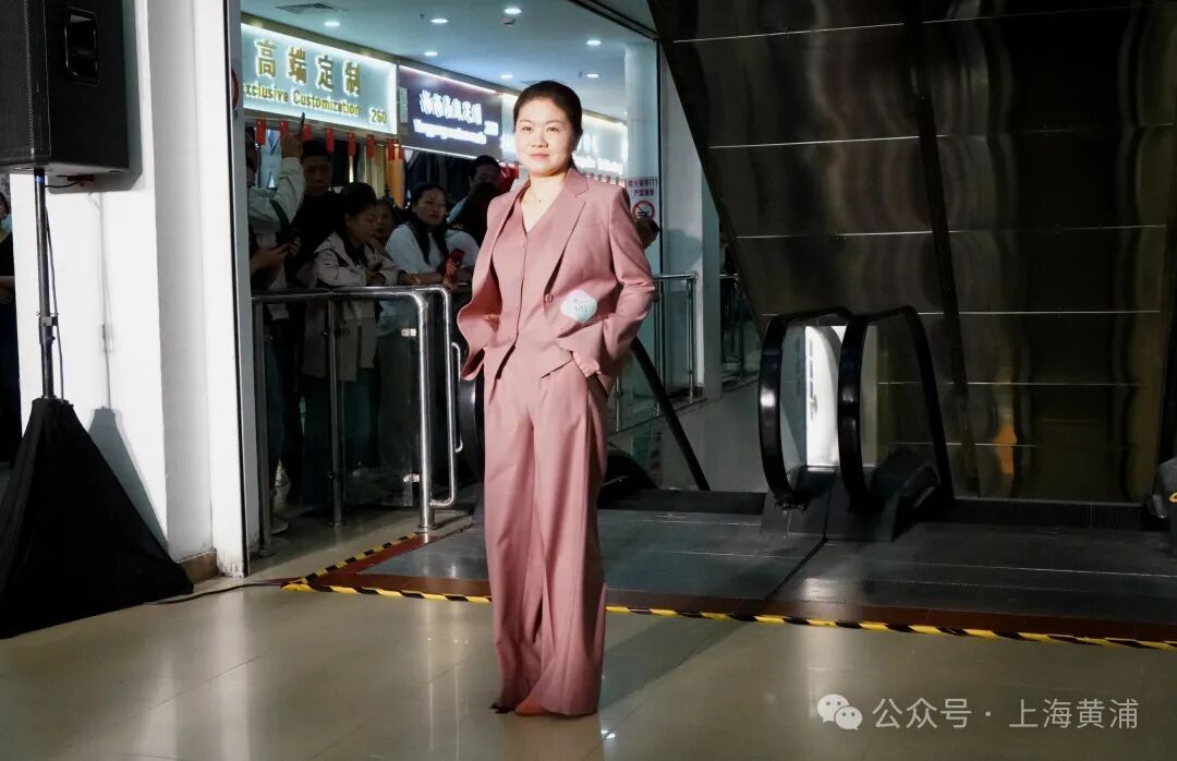 走秀作品聚焦实用亲民、贴近生活的海派旗袍、商务西装、新中式礼服、日常定制成衣,兼顾高端质感与大众需求,覆盖中外审美与日常穿着。每件成衣均配有中英双语标识牌,清晰标注店铺信息、匠心亮点与联系方式,市民、游客可近距离触摸面料、咨询工艺、现场对接下单,实现 “展示即体验、观秀即消费”。