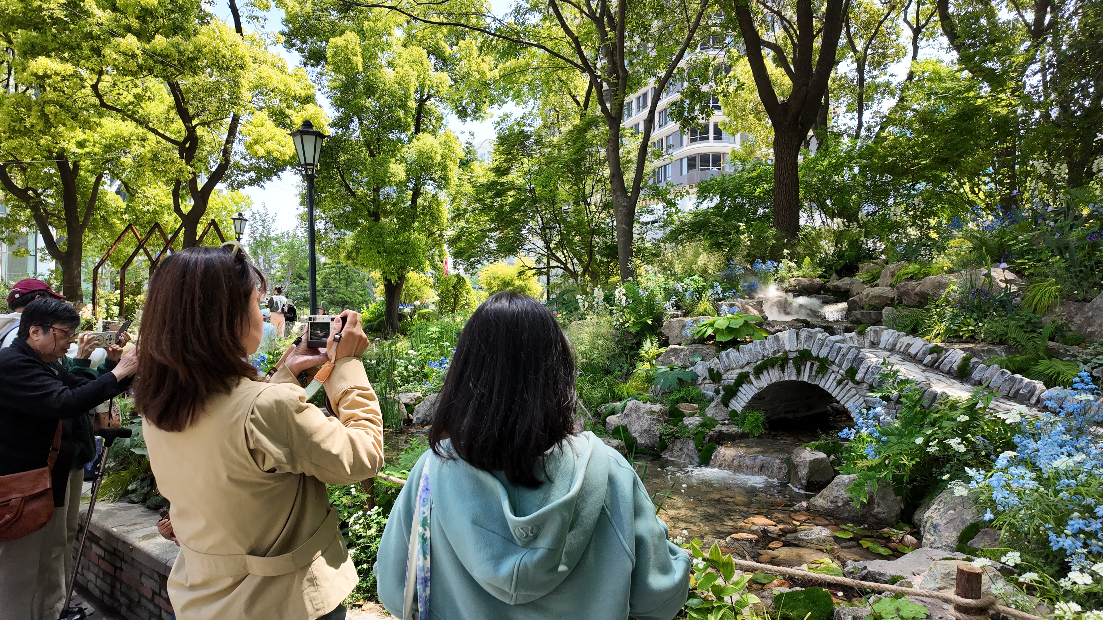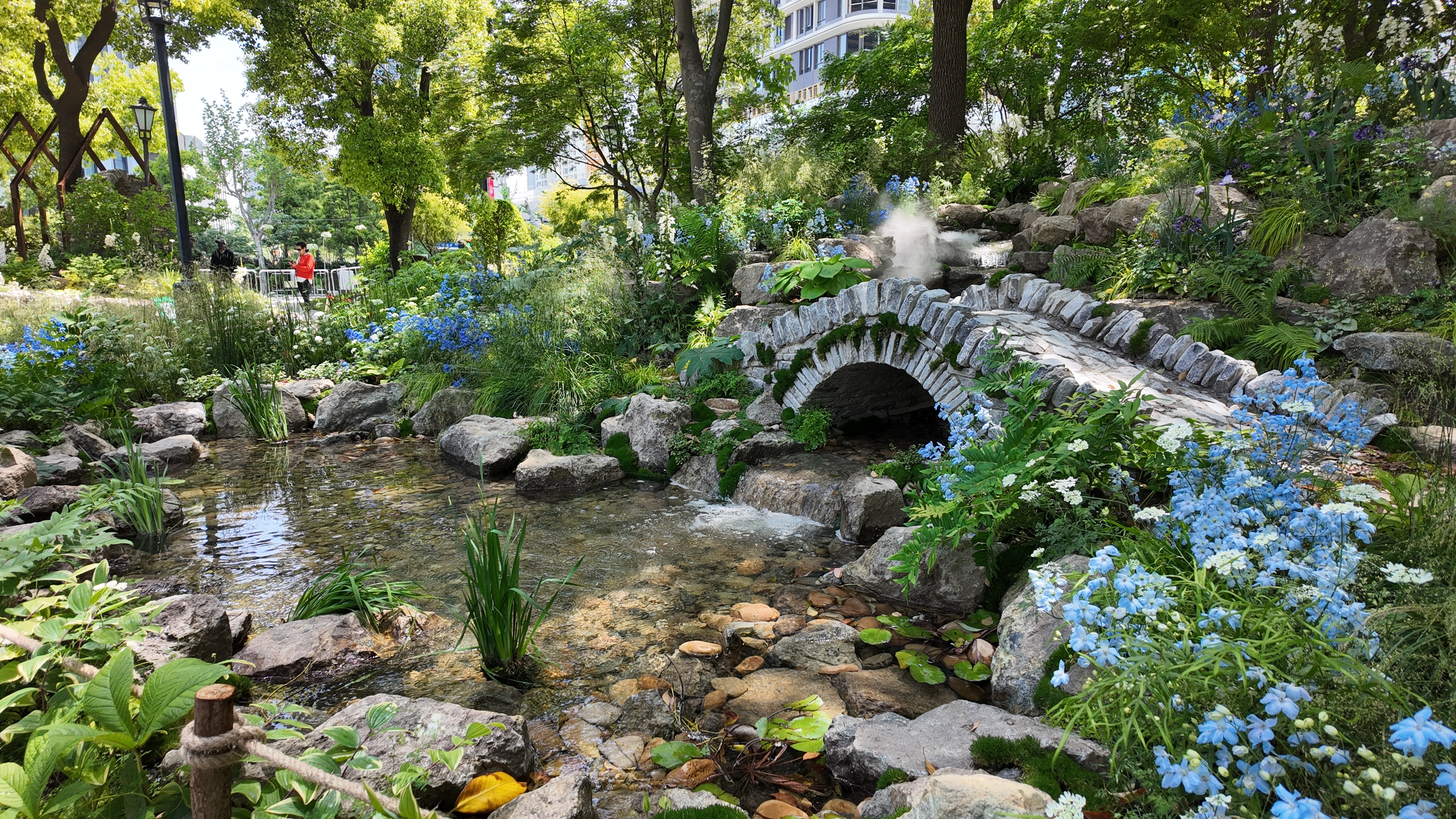在众多引人入胜的作品中,《溪流的私语》主题作品以其独特的魅力吸引了大量游客。该作品位于自忠路吉安路,设计师巧妙运用众多石头,直接打造出一个宛如世外桃源般的林荫下溪流花园。踏入其中,小桥流水潺潺作响,缭绕的雾气如梦如幻,阳光透过枝叶的缝隙洒下,形成一片片光影斑驳的美景。而穿插在青翠繁茂植物中的蓝色、紫色小花,更是为整个花园增添了一抹灵动而绚丽的色彩,让人仿佛置身于童话世界,流连忘返,眼睛和相机都忙不过来,生怕错过任何一个精彩瞬间。