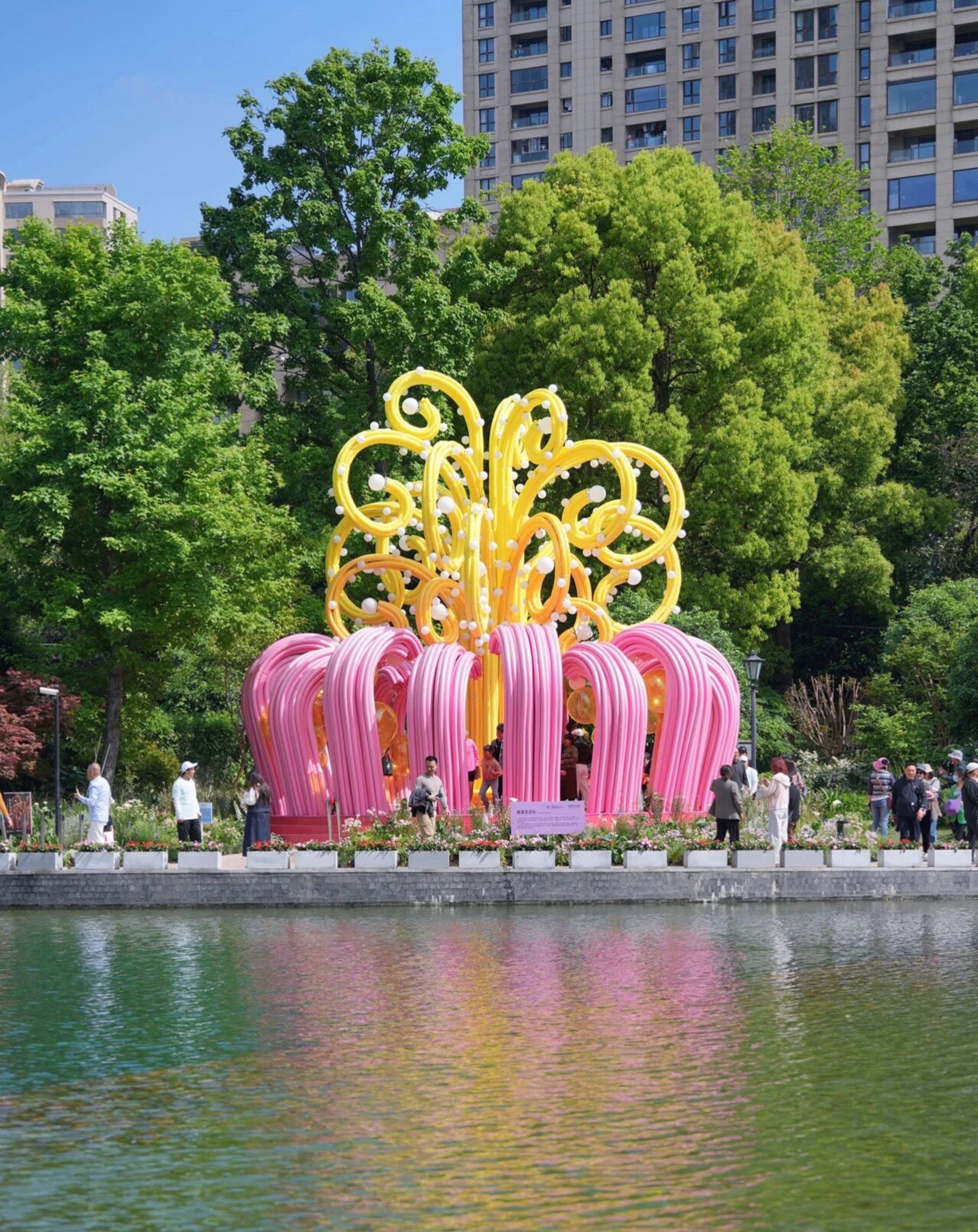 位于核心区域的“白玉兰之心”无疑成为了全场焦点。这一令人瞩目的装置艺术,是艺术创作者们匠心独运的杰作。数百捆粉色和黄色的泡沫塑料条经过精心切割、细致塑形,再巧妙地套在钢架上,摇身一变成了逼真的白玉兰花蕊。这些花蕊簇拥在一起,仿佛是一群灵动的精灵在欢快舞蹈。周围搭配着洁白如雪的仿真花瓣,层层叠叠,在阳光的照耀下散发着柔和而圣洁的光芒,恰似一朵盛开在天地间的巨大白玉兰。微风拂过,花瓣轻轻摇曳,仿佛在诉说着上海这座城市的浪漫与优雅。周围还点缀着各种色彩鲜艳的草本花卉,红的似火、粉的如霞、黄的胜金,与“白玉兰之心”相互映衬,构成了一幅五彩斑斓、美轮美奂的绝美画卷。