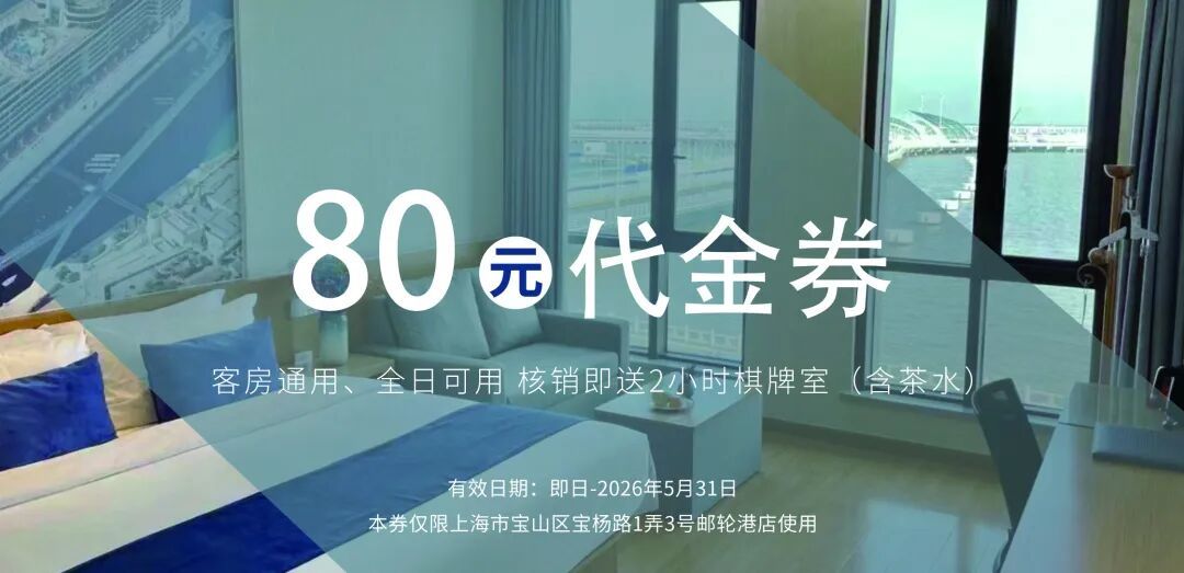 1.仅限上海市宝山区宝杨路1弄3号邮轮港店客房使用,门市价基础上立减80元。核销即赠2小时棋牌室使用(含免费茶水,先到先得)。