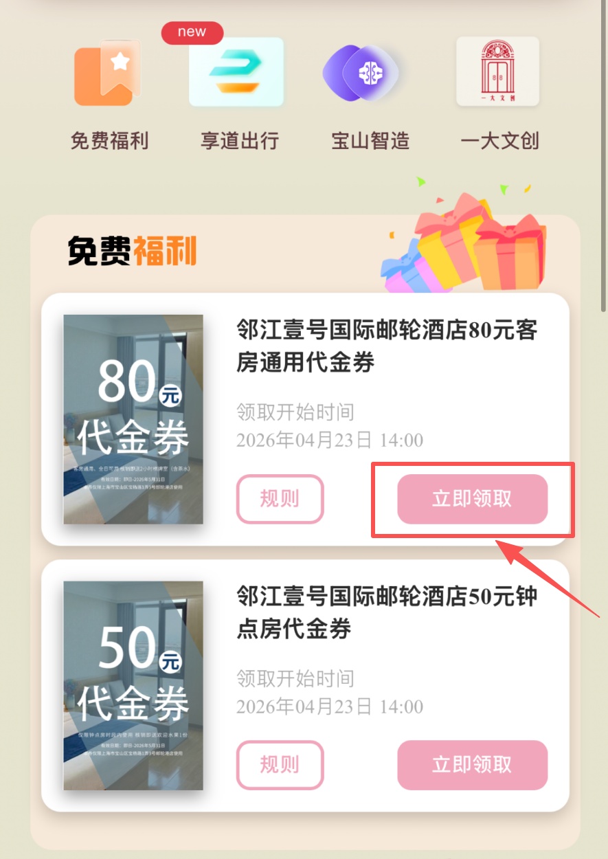 领取邻江壹号国际邮轮酒店代金券啦!