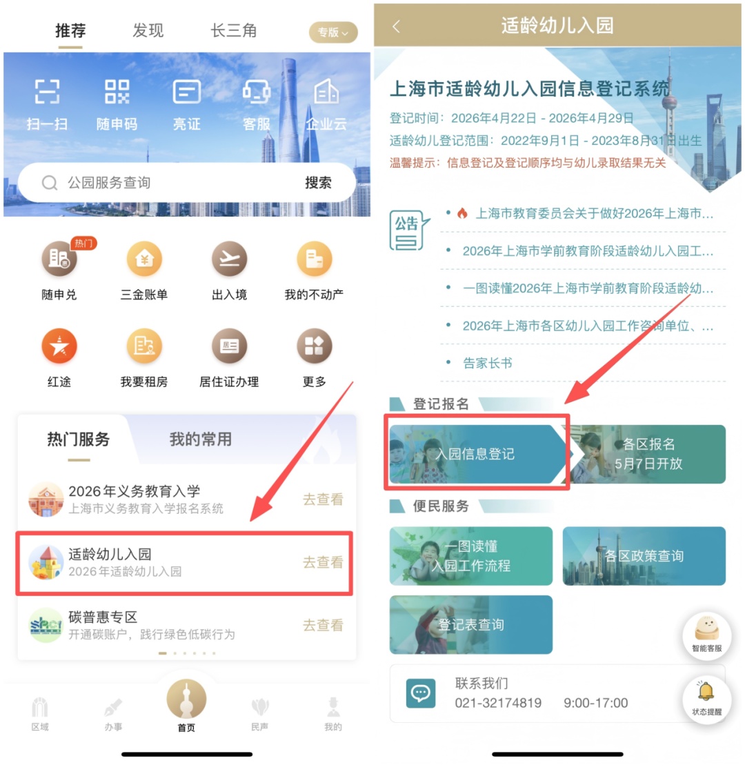 适龄幼儿监护人可使用自己的“一网通办”账号,登录“上海一网通办”网站(https://zwdt.sh.gov.cn)或手机APP“随申办市民云”,或在微信搜索小程序“随申办”、支付宝搜索“随申办”,首页热门服务“2026年适龄幼儿入园”,办理入园信息登记。