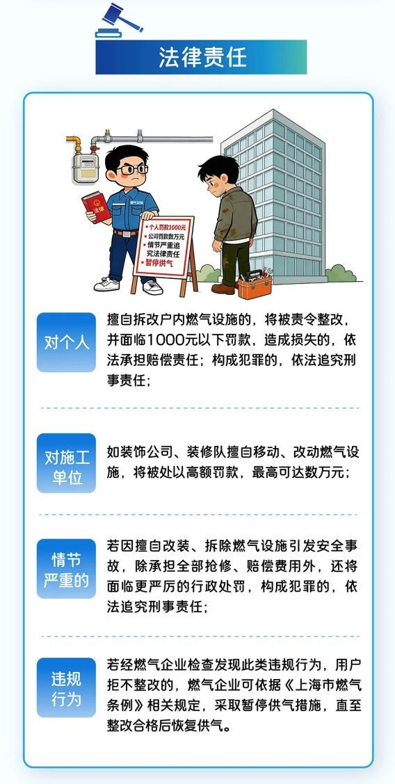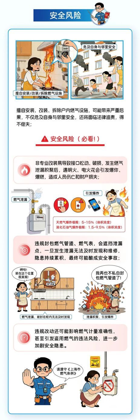 市住房城乡建设管理委介绍,燃气安全无小事,违规改装隐患大。新施行的《上海市燃气条例》对户内燃气设施使用作出明确规定,擅自安装、改装、拆除燃气设施均被禁止。这份安全提醒,请每位市民收好↓