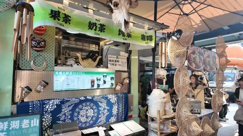 走着走着,你会遇到一个风格完全不同的摊位——牛头、银饰、竹编……一眼就能看出不一样。这里卖的,是苗族的茶。不过需要注意的是,这里的茶限量售卖。