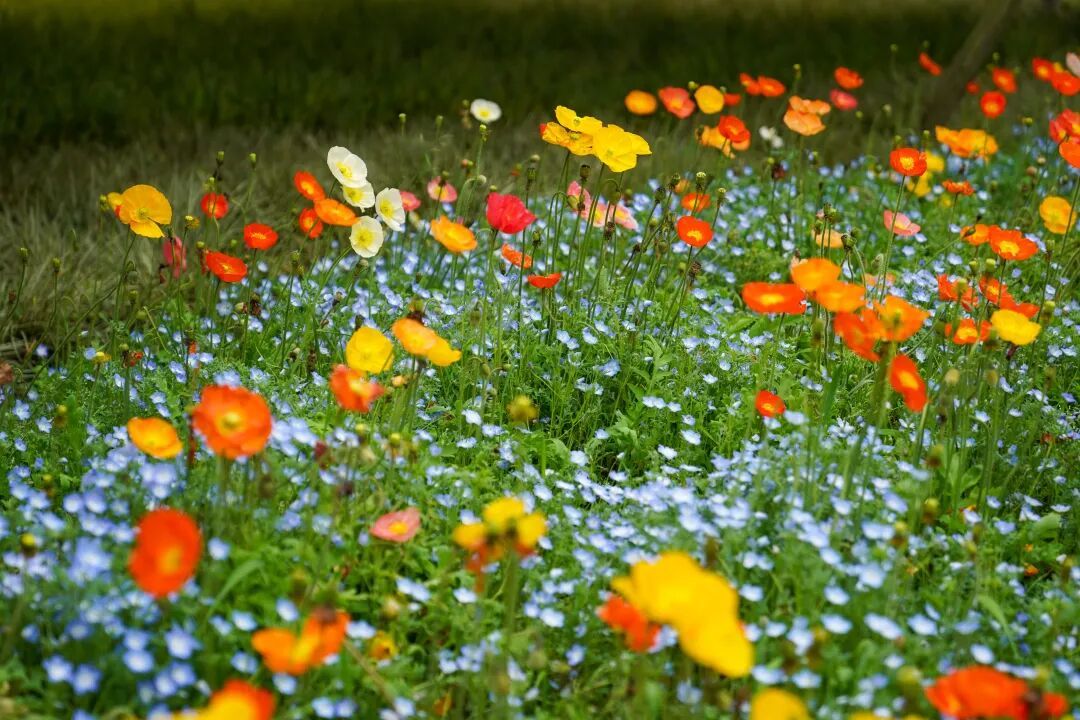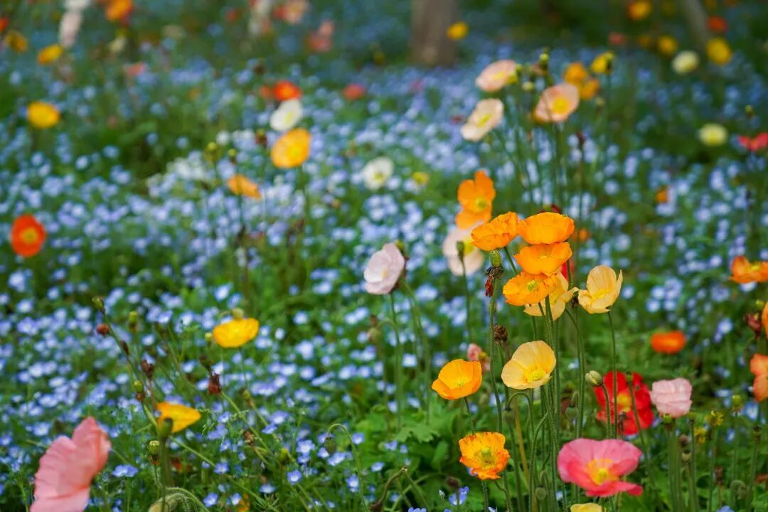 除了公园入口最具冲击力的春日名片外,沿着公园的人行廊桥向深处漫步,还有一幅截然不同的春日图景。沿着廊桥呈带状分布的喜林草与虞美人花海,面积也有近三千平方米,宛如一条飘逸的彩色丝带镶嵌在绿野之上。大片喜林草铺就“蓝色地毯”,淡蓝色的花朵细碎而密集,高低错落的虞美人则在风中轻盈摇曳,似在翩翩起舞,让人仿佛一秒走入了莫奈笔下的春日幻境,随手一拍便是无需滤镜的大片。