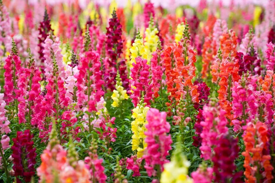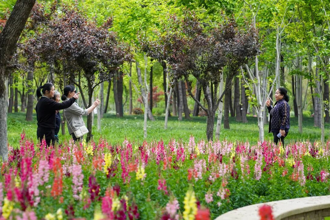 步入公园正门,最先映入眼帘的是成片正在盛放的金鱼草花海。一株株金鱼草沿着花穗自下而上渐次盛开,宛如一支支巨大的彩色蜡烛插在大地上。从热烈的绯红到娇嫩的粉红,从明媚的亮黄到深邃的紫红,层层叠叠的花茎上各种色彩交织在一起,又似千万尾灵动的小鱼在碧叶间嬉戏。高低错落的花株带着原生野趣,以随性而热烈的姿态打破了规整园林的束缚,将近三千平方米的花田晕染成一幅鲜活的春日织锦。