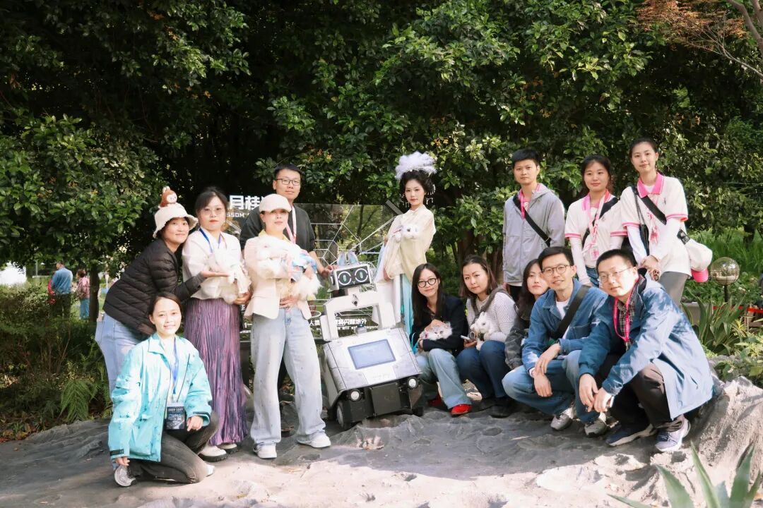 花园以银灰色仿真月壤打造环形山、月海地貌,还原月球表面肌理。古装演员扮作嫦娥翩跹起舞,萌宠互动区里,兔子爱好者携真兔亮相,化身“玉兔”与嫦娥相映,生动复刻月宫神话。