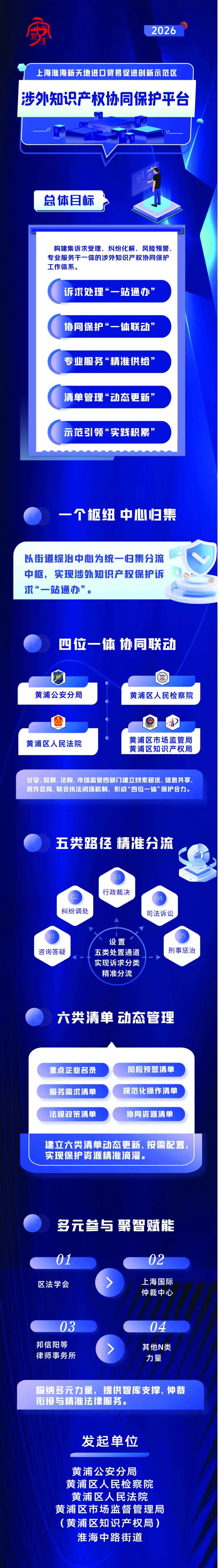 这一典型案件的发生,让淮海中路街道意识到涉外知识产权协同保护的必要性和紧迫性。近日,由淮海中路街道牵头,黄浦区公安分局、区市场监管局(知识产权局)、区人民检察院、区人民法院共同参与制定的《上海淮海新天地进口贸易促进创新示范区涉外知识产权协同保护平台工作方案》正式出台。协同保护平台以“1+4+N”组织架构为核心,着力构建集诉求受理、纠纷化解、风险预警、专业服务于一体的涉外知识产权保护体系,标志着示范区在探索基层涉外知识产权协同治理方面迈出关键一步。