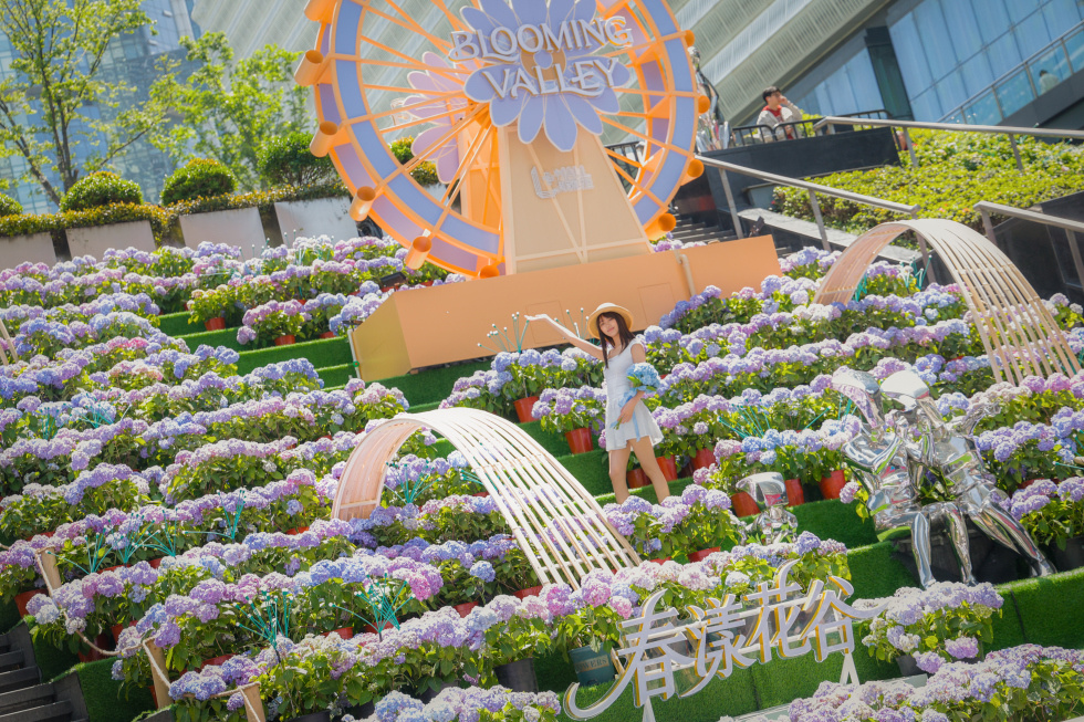 2026上海国际花卉节浦东分会场人气高涨。陆家嘴中心L+Mall下沉广场化身为一片静谧绚烂的“春漾花谷”,各色绣球在台阶上层层铺展,在城市中心塑造出一片千平方米的疗愈花海。