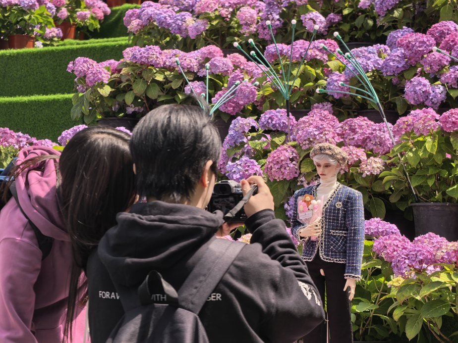 毛毛的娃娃是热门游戏《恋与深空》中的角色“夏以昼”,在游戏里有一张卡面正是关于绣球,她听说这片绣球花海后专程前来,给娃娃搭配了一套帅气利落的校服。托托则给自己的娃娃搭配了蓝色系外套,80厘米高的BJD娃娃手持花束,笔直站立在花海中,很多市民也被精致的娃娃吸引。
