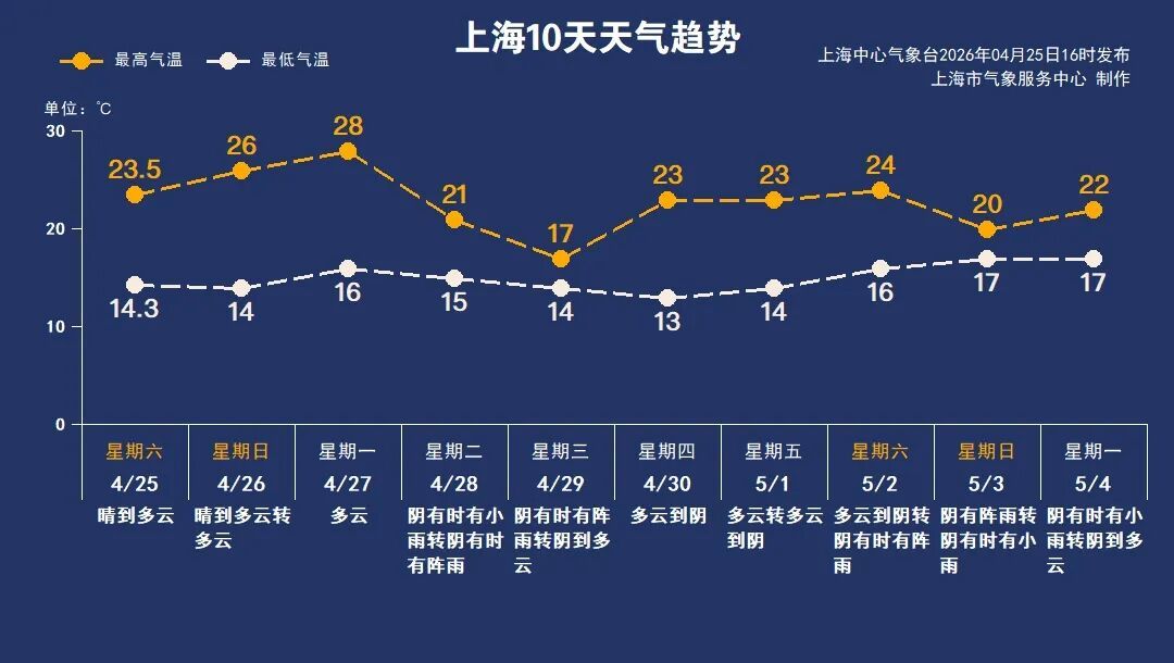 未来一周天气呈现过程性晴雨交替的特点。周一气温继续“起飞”,最高可达28℃上下,来到近期顶点,白天短暂体验初夏感,早晚还是有些偏凉。下周二至周三一次明显的降水和大风过程上线,最高气温也会回落至17℃左右,体感如同换季,注意合理着装防感冒。下月初还将有一次降雨过程,请大家多关注最新天气变化。 资料:上海天气发布 编辑:程 前 责编:高 琴 *转载请注明来源于“上海长宁”