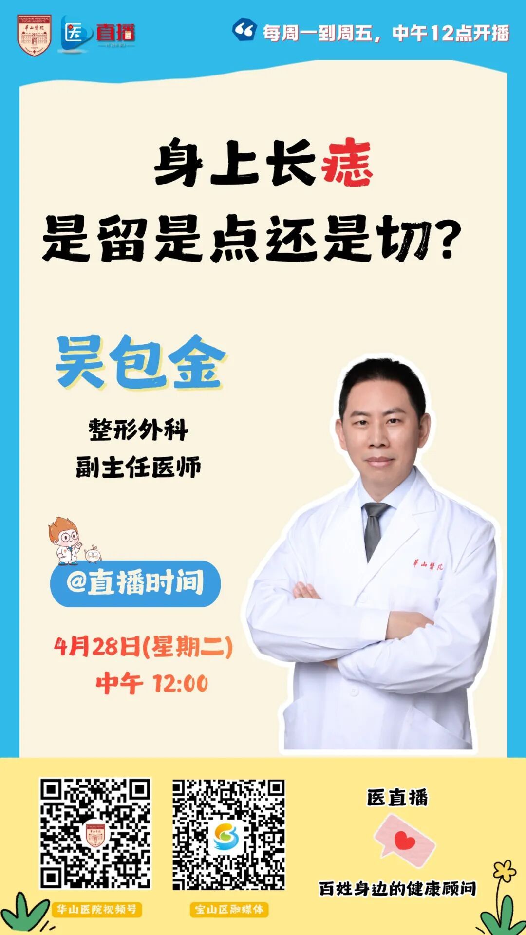 几乎每个人身上都有痣,但您知道吗?有些看似不起眼的痣,可能是潜伏的“健康杀手”。脚底的痣经常摩擦会恶变吗?脸上的痣影响颜值是该“点”还是该“切”?为什么有的痣激光后反而长得更大?本期医直播,复旦大学附属华山医院整形外科副主任医师吴包金,将带您了解痣的点点滴滴。有痣不慌张,科学来帮忙。欢迎预约,学会辨别,对自已的皮肤健康负责!