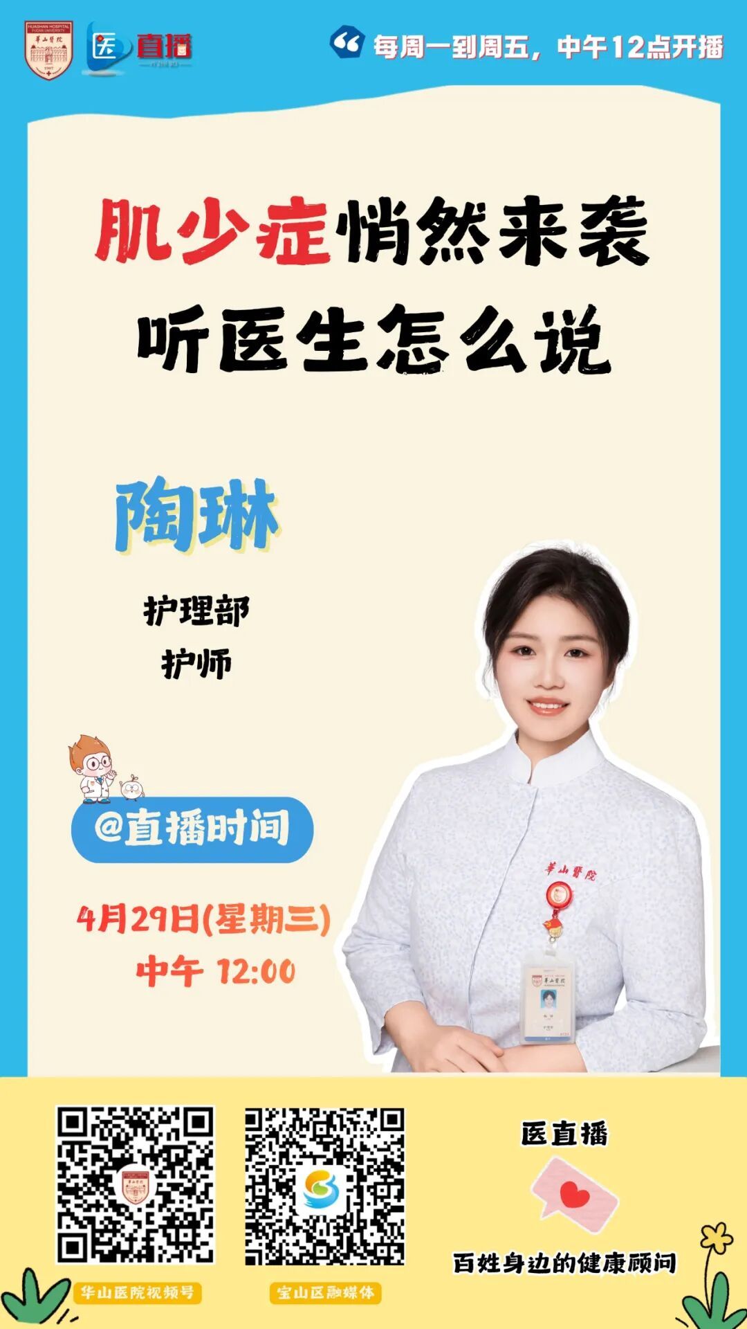您是否常有这些困扰:走路拖沓迟缓、腿脚发软、平衡感变差?久坐后起身困难,行动越来越吃力?手部力气大不如前,拧盖提物倍感费劲?身形慢慢消瘦,肌肉不知不觉变少、变松弛?稍作活动就疲惫不堪?这些表现,都是肌少症发出的重要预警。肌少症是典型的年龄相关性慢性问题,核心表现为肌肉量持续减少、肌力衰退、活动能力下降,会显著增加跌倒、失能、反复住院的风险,也给家庭照护带来沉重压力。人过60岁,肌肉加速流失,与其被动衰老,不如主动预防。本期医直播,复旦大学附属华山医院护理部护师陶琳,将带您全面认识肌少症,从自测方法到日常养护,一站式分享实用防治方案。