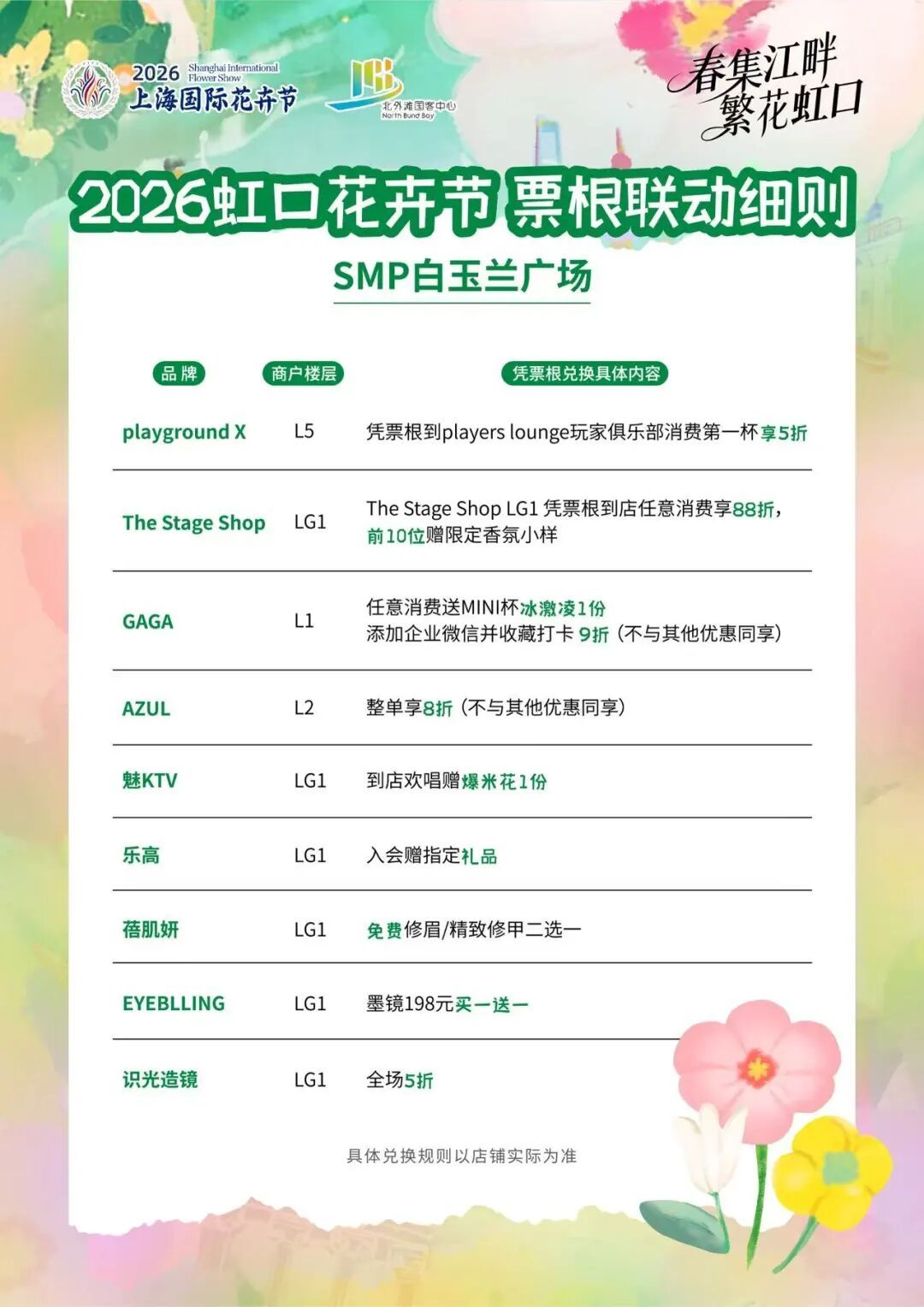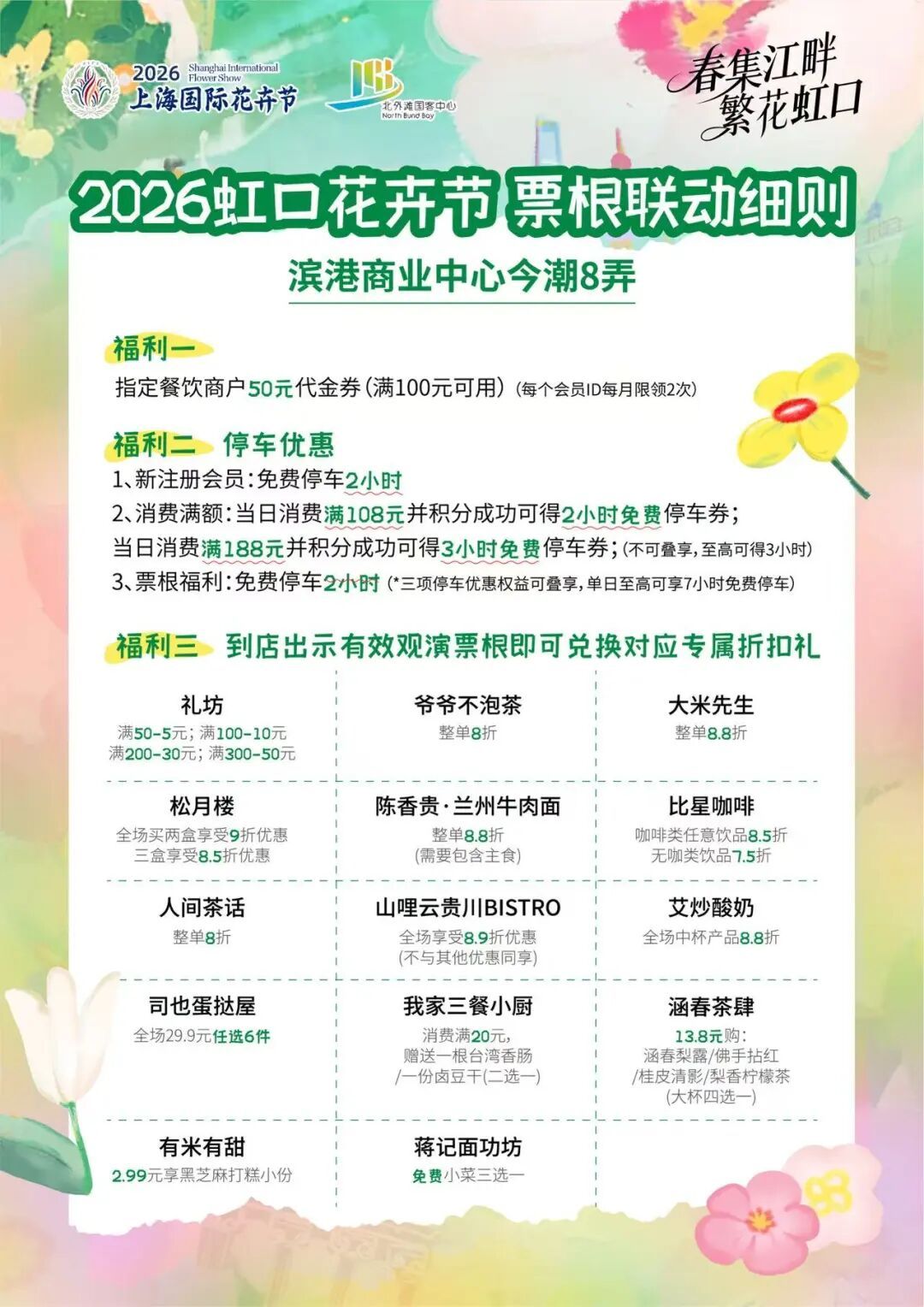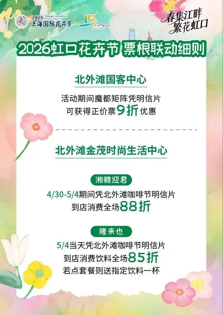 此外,本次虹口花卉节深度融合文商旅体展,以花为媒、以券为链,实现票根联动。活动期间,游客在花卉节现场参与线下打卡互动,可免费领取鲜花一枝及活动限定明信片一张。凭此明信片,可前往虹口区白玉兰广场、滨港商业中心今潮8弄、魔都矩阵、北外滩金茂时尚生活中心等多家指定商场及商户,享受餐饮、娱乐、零售等专属优惠,实现“赏花、休闲、消费”一站式体验,让花卉节不仅是赏景盛会,更成为带动区域消费、丰富市民生活的重要平台。
