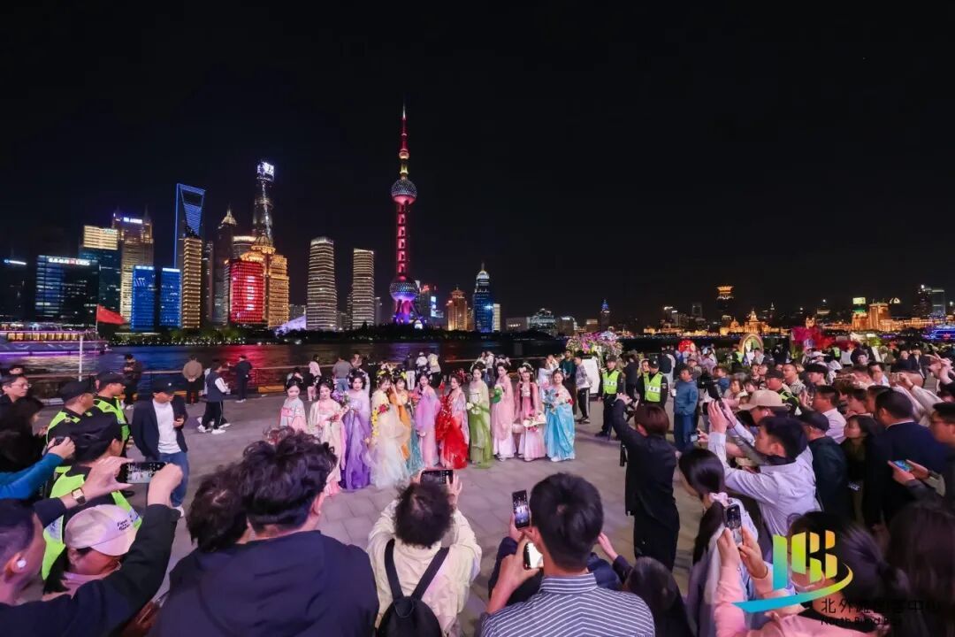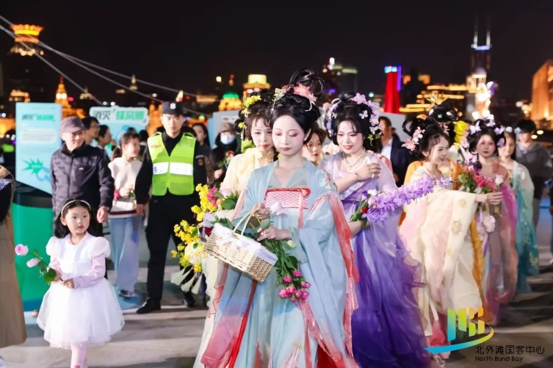 开幕式当晚,花神巡游队伍沿着滨江动线缓缓前行,演员们身着主题服饰与游客赠花、合影。