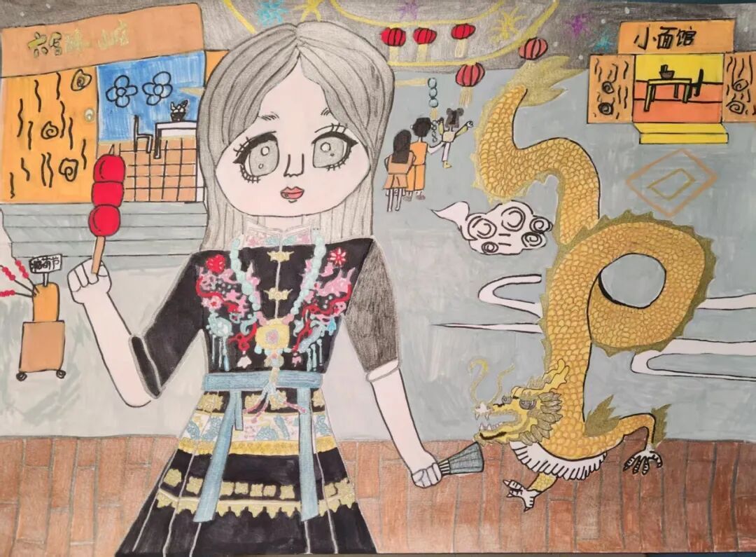 简介:这幅作品作者用一条神气的巨龙,把武汉黄鹤楼和上海东方明珠连在了一起!一边是千年名楼,一边是现代高塔,还有祥云、火车做点缀。长江两头的两座大城市,从历史流向未来,一起奔向更美好的未来!