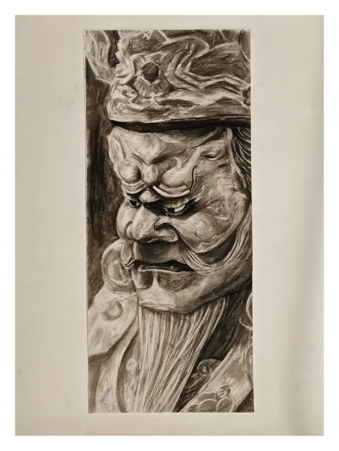 简介:这幅素描聚焦护法神像特写,以细腻的明暗层次刻画威严沉毅的神情,刚劲的肌理与肃穆的气韵尽显传统造像的庄重之美。