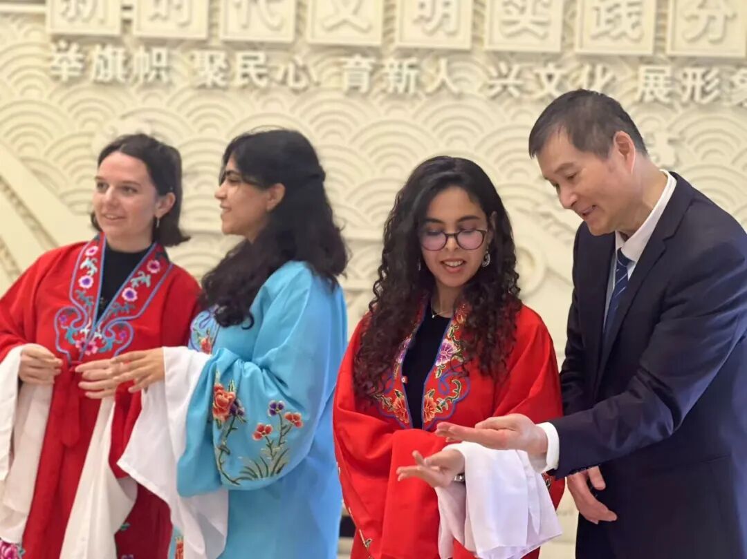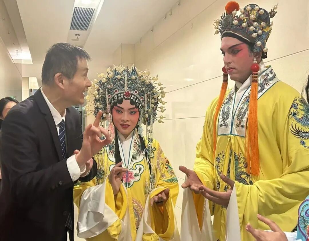 演出结束后,“洋小生”“洋花旦”身着戏服走上舞台,在京剧队演员的带领下学习水袖、云手、亮相等基础身段动作。虽然文化背景不同,但一招一式中传递的美感与韵律,让留学生们兴致盎然,台下观众也报以热烈的掌声和欢笑声。