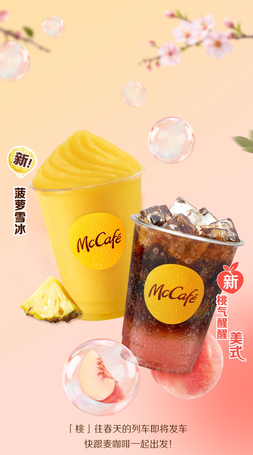 春困退散!麦咖啡 “反春困联盟” 邀你入伙!除了经典美式、奶铁,更有菠萝雪冰、咖啡阿芙佳朵、桃气醒醒美式等限定特饮助阵!浓醇咖啡碰撞清新果香,快乐就像气泡水,咕嘟咕嘟冒出来!