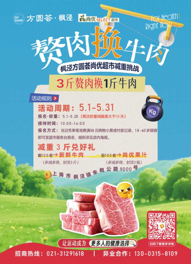商场携手尚优超市推出“赘肉换牛肉”特色活动,活动时间贯穿5月1日至5月20日。