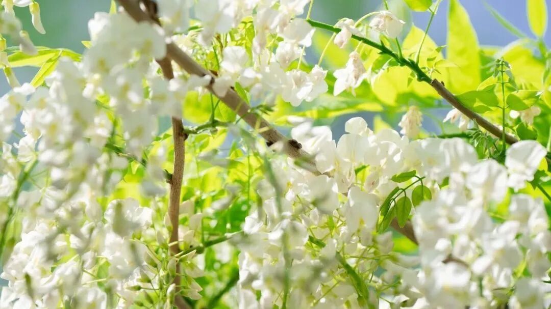 白色的安了寺紫藤洁白如雪,仙气飘飘,与紫、粉两色形成鲜明对比,点缀在花海之中,更显清新雅致。