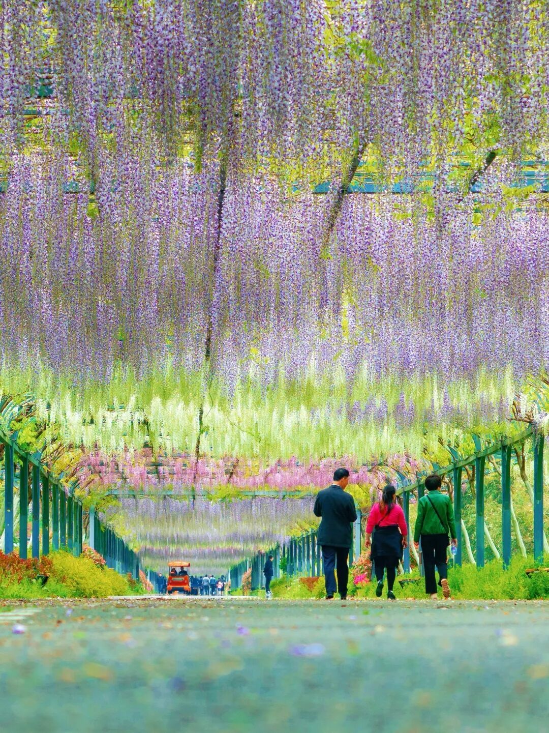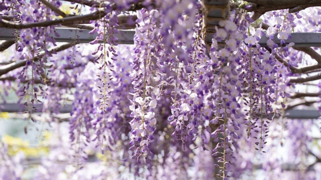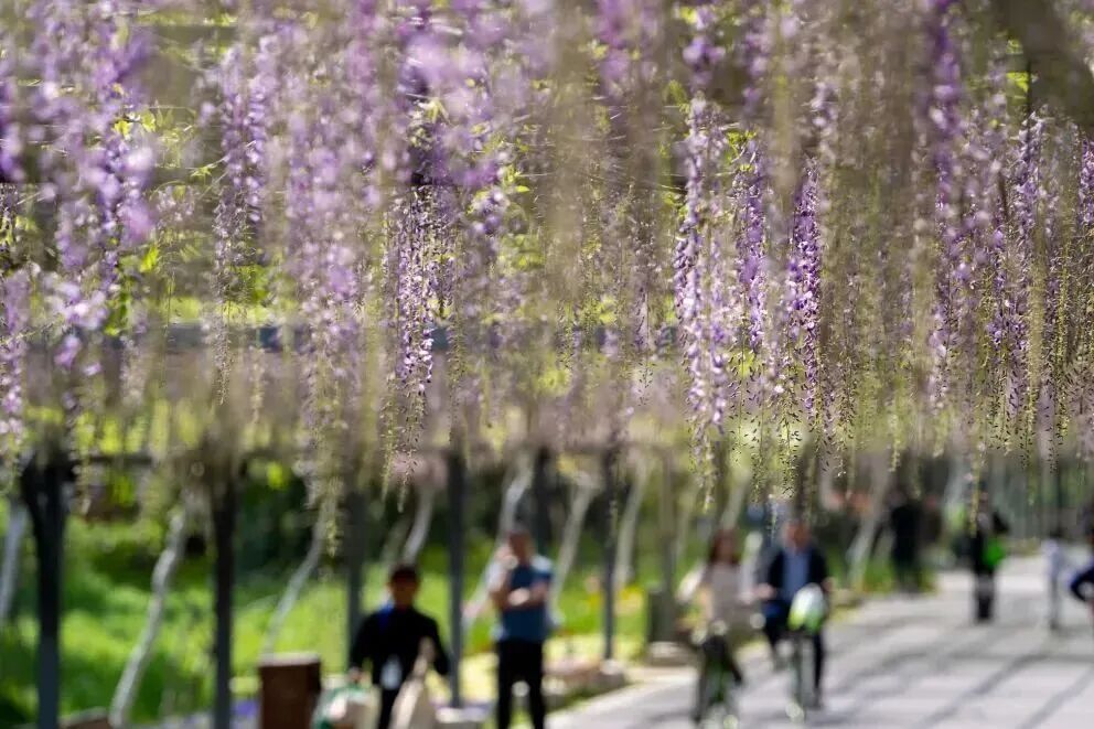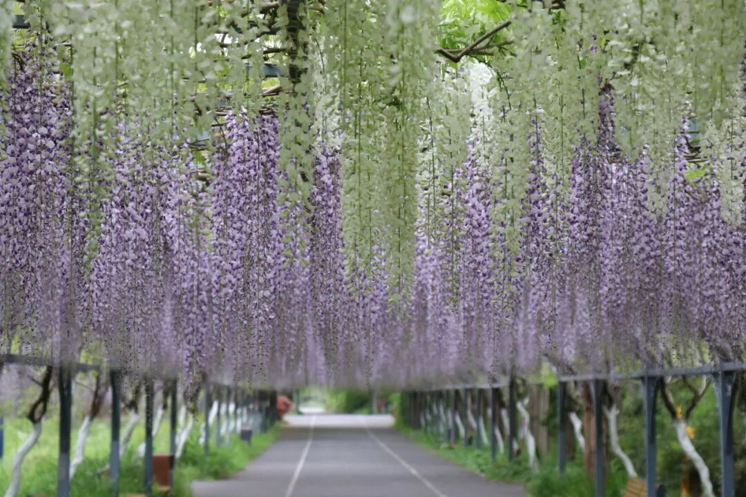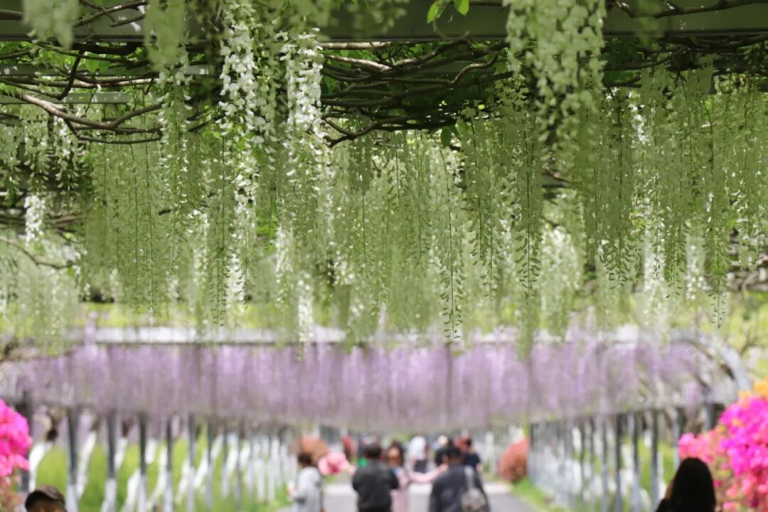 长廊种植了不少知名紫藤品种,以浪漫紫色为主调,清新粉白作点缀,花穗修长且形态多变,每一串花穗都独具美感。