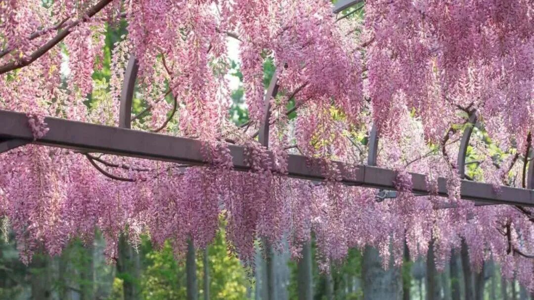 粉色的阿知紫藤色泽粉嫩柔和,宛如少女的裙摆,轻盈灵动,微风拂过,自带温柔滤镜,氛围感直接拉满。