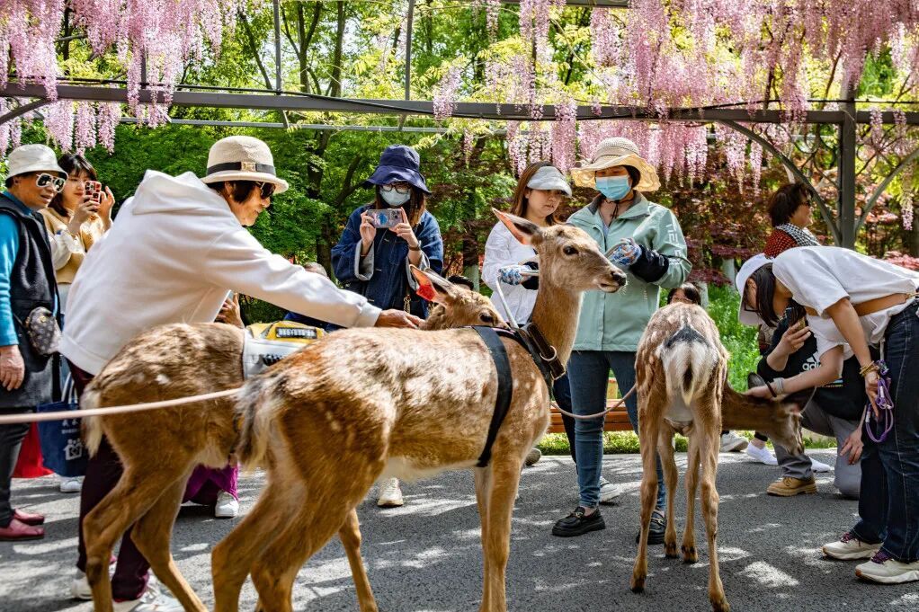 除了紫藤长廊,公园内还有多个必打卡点位:鹿乐苑可观看小鹿巡游,免费投喂互动;孔雀园每日有孔雀放飞,抓拍开屏瞬间绝美。